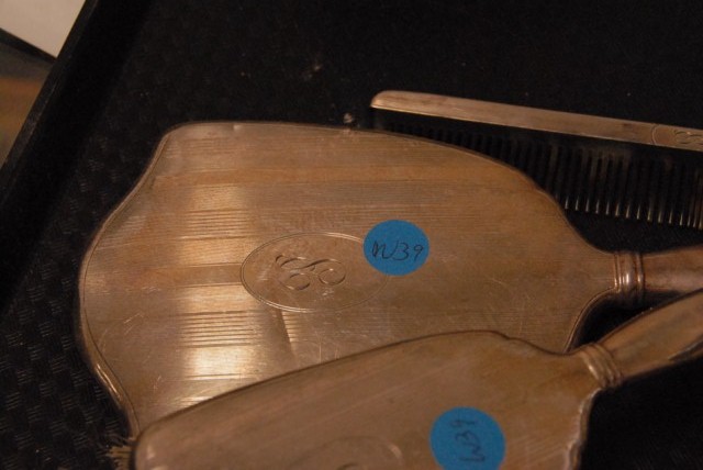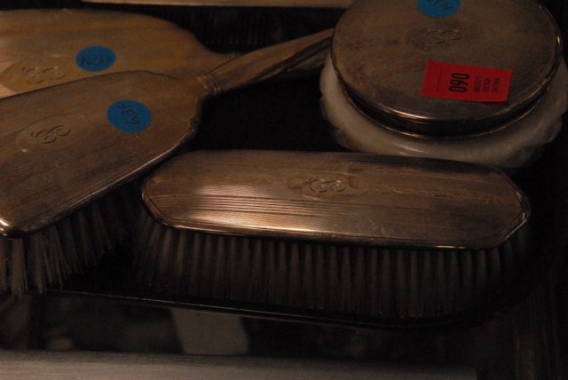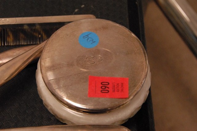 Sterling silver five piece dresser set brushes, mirror, comb and covered jar.