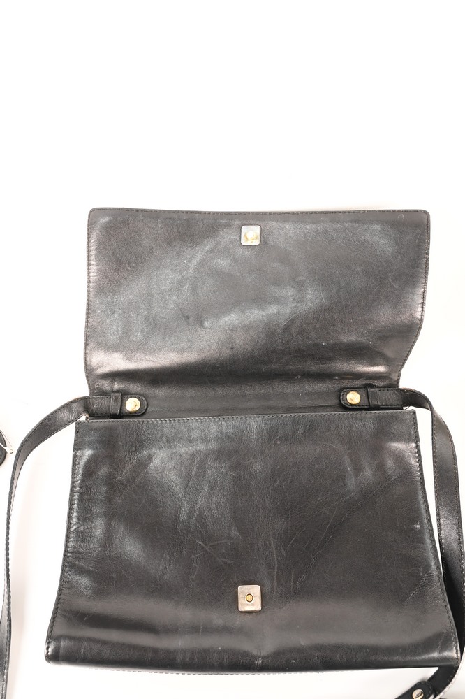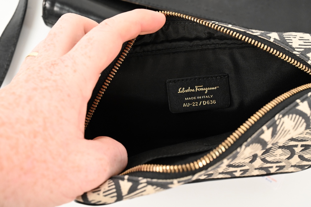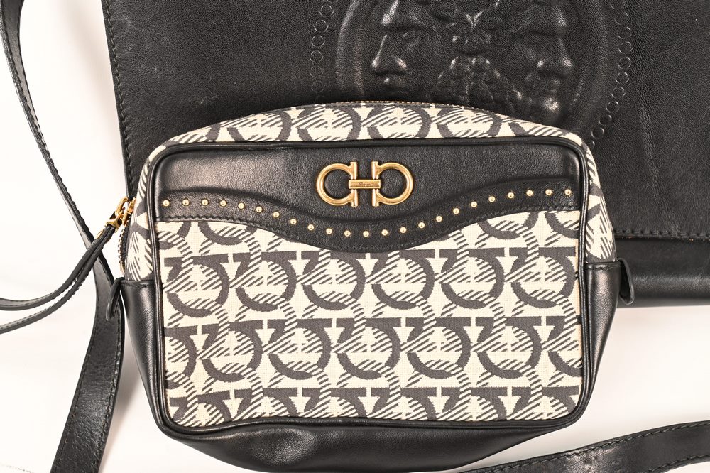 Two Piece Lot, to include vintage Fendi “Greek God” shoulder bag, having leather lined single compartment, gold tone hardware, and adjustable leather shoulder strap; along with a Ferragamo wristlet clutch, having black and white fabric; both in used condition, some scratches to leather, largest height 9 1/2 inches, width 12 1/2 inches.
