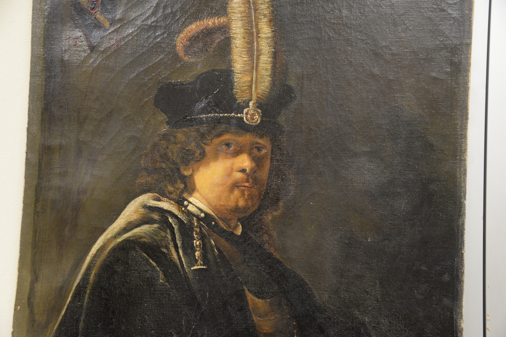 Lot 901: 19th Century or Later Copy of Rembrandt’s Self Portrait, Wearing a White Feathered Bonnet, oil on canvas with a war seal on the re…