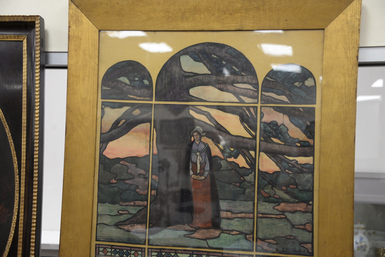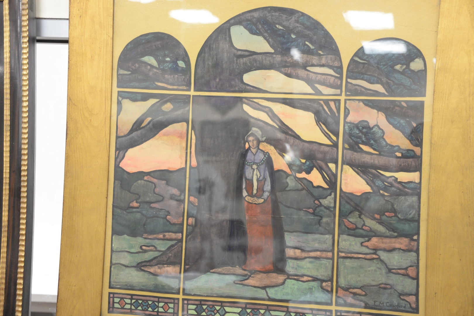 Esther Mabel Crawford American, 1872 – 1958, framed triptych of a religious scene, watercolor and pencil on paper, signed lower right E.M. Crawford overall 29 x 28.