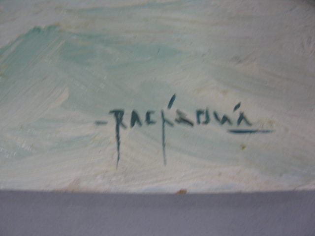 Racksona oil on board ocean shoreline, small computer desk with a large mirror and folding tables.