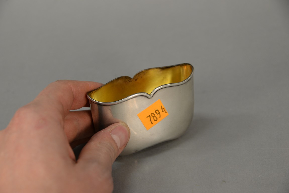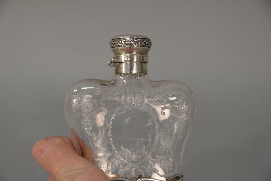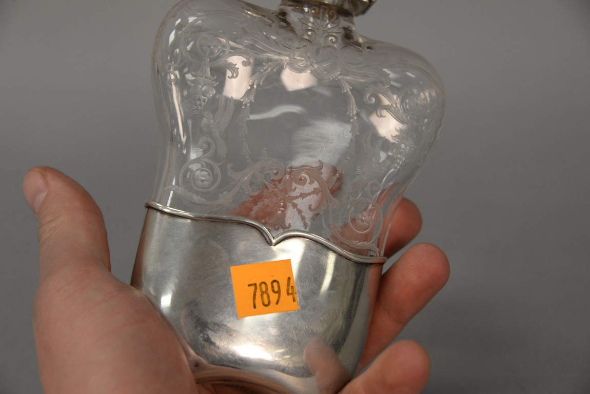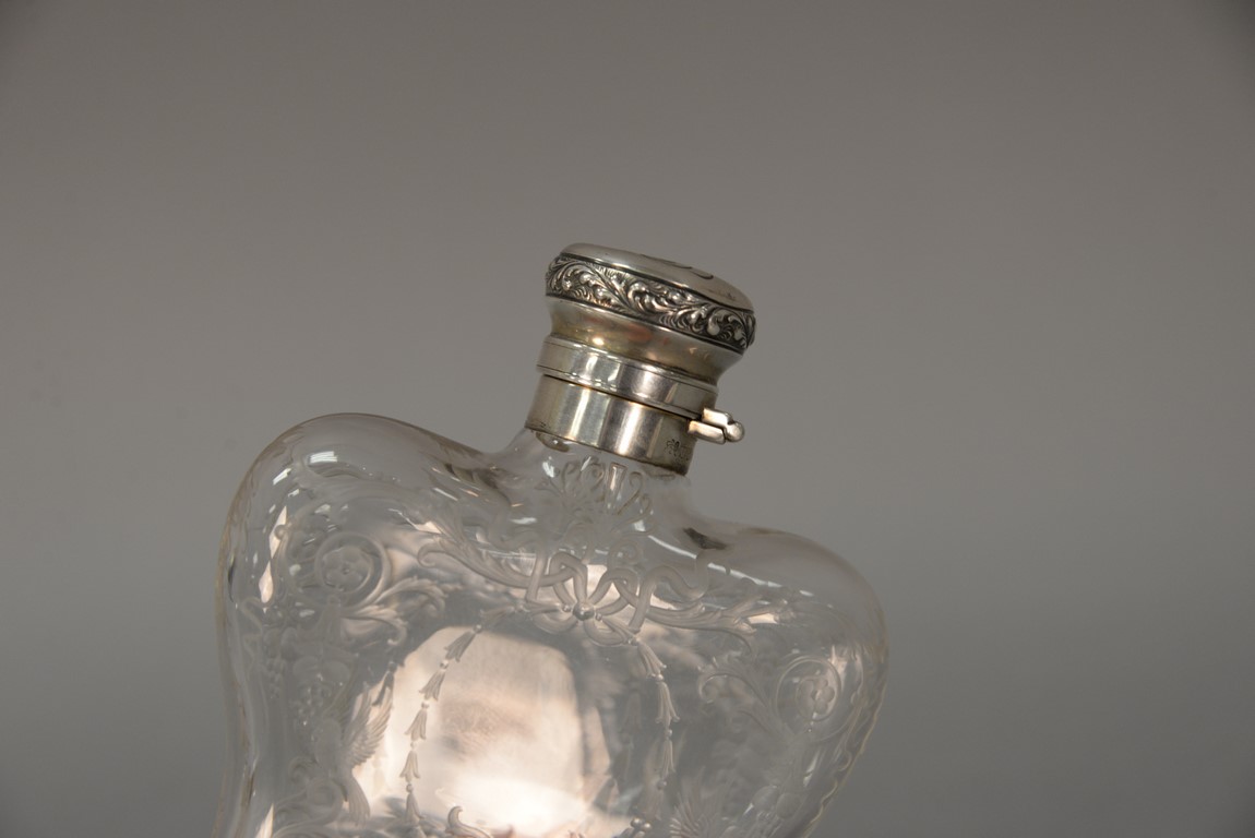 Lot 90F: Gorham flask, crystal and sterling finely engraved with birds, fruit, and foliage, marked on bottom S 2556. 7 x 4