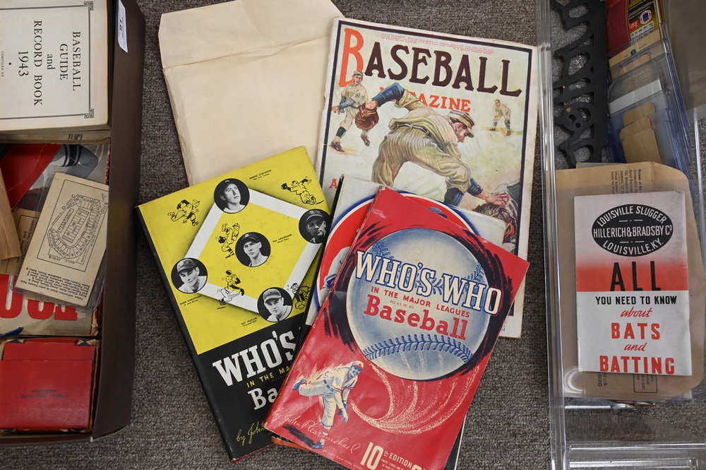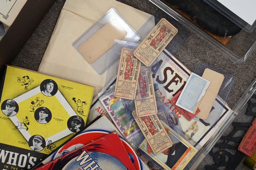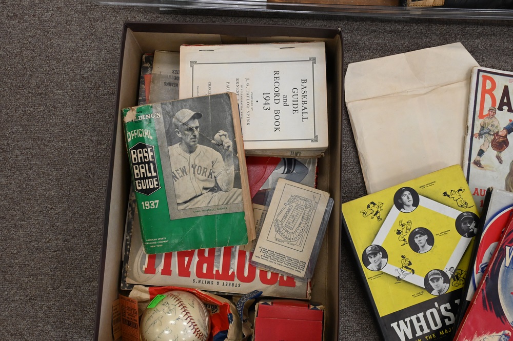 Lot 91: Assorted Group of Football and Baseball Memorabilia, to include Harvard, Notre Dame, Dartmouth, Boston University tickets, Fenway Park tickets, baseball printed photos, baseball magazine, Street and Smith’s football magazines, boxing gloves, old ticket stubs, etc.