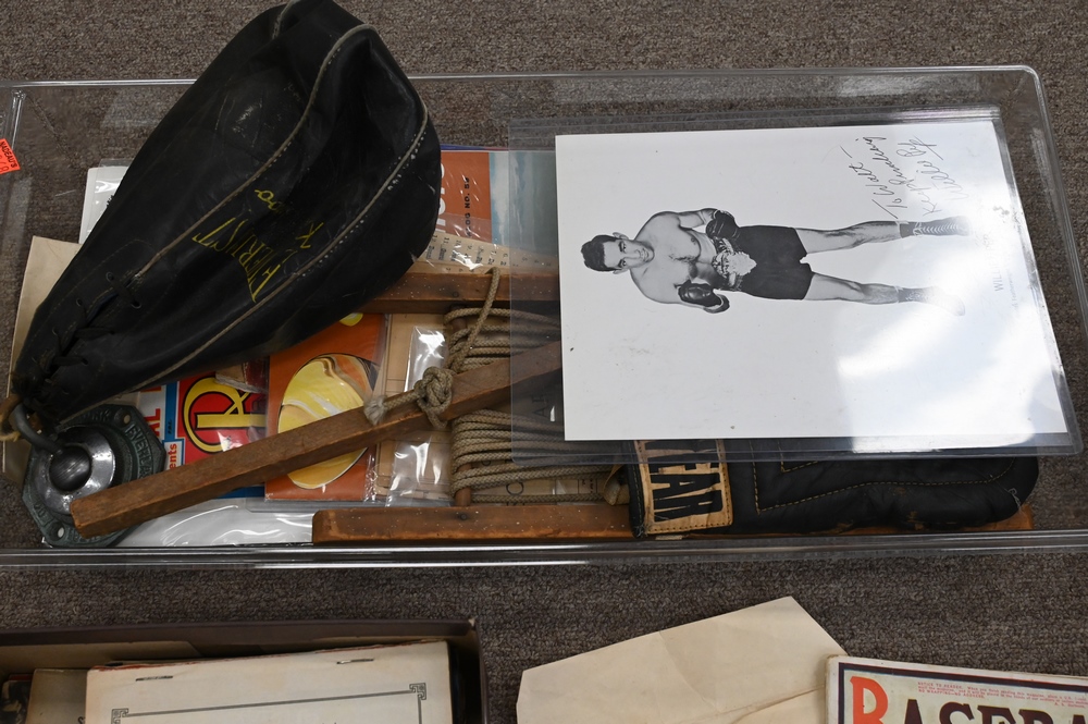 Assorted Group of Football and Baseball Memorabilia, to include Harvard, Notre Dame, Dartmouth, Boston University tickets, Fenway Park tickets, baseball printed photos, baseball magazine, Street and Smith’s football magazines, boxing gloves, old ticket stubs, etc.
