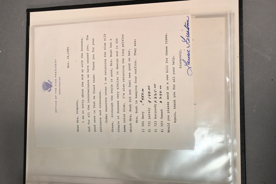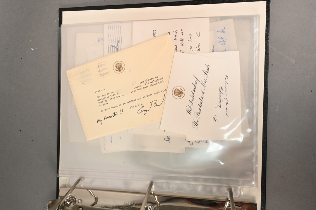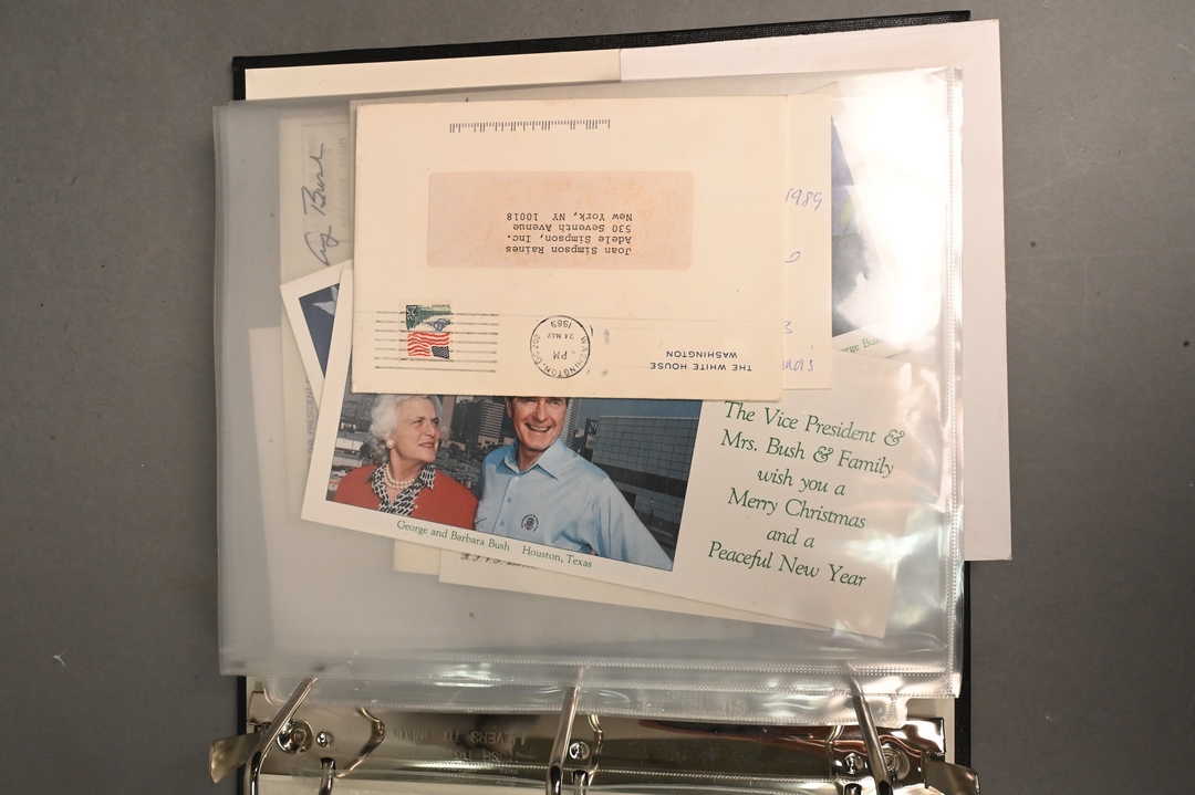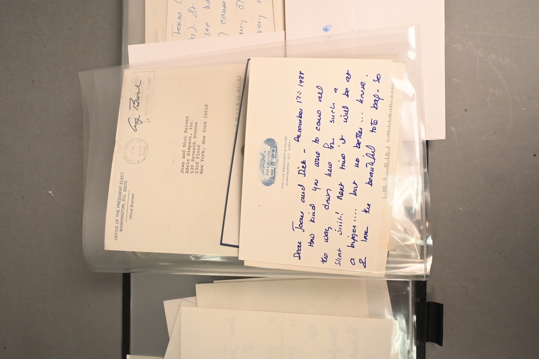 Binder of Approximately 60 Presidential Letters, Pictures, Postcards and Signatures, most on White House and Vice President paper, most signed by Barbara Bush to Joan and Richard Raines.