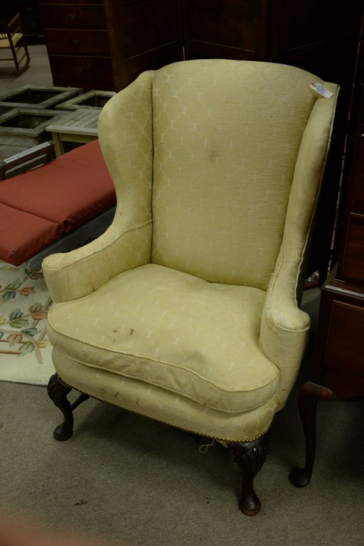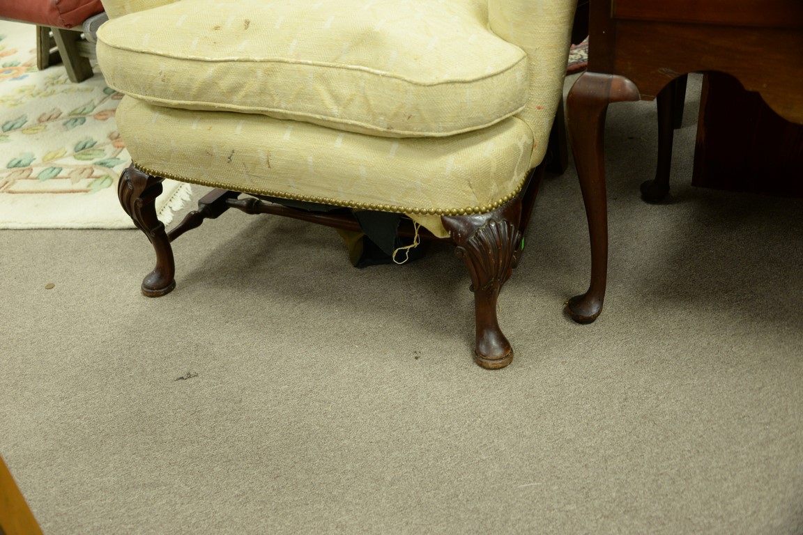 Custom mahogany Queen Anne style wing chair having shell carved knees and stretcher base.