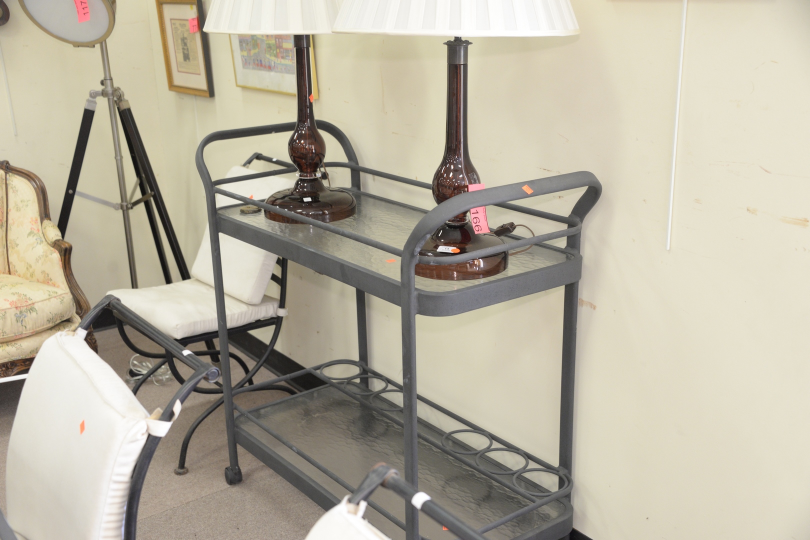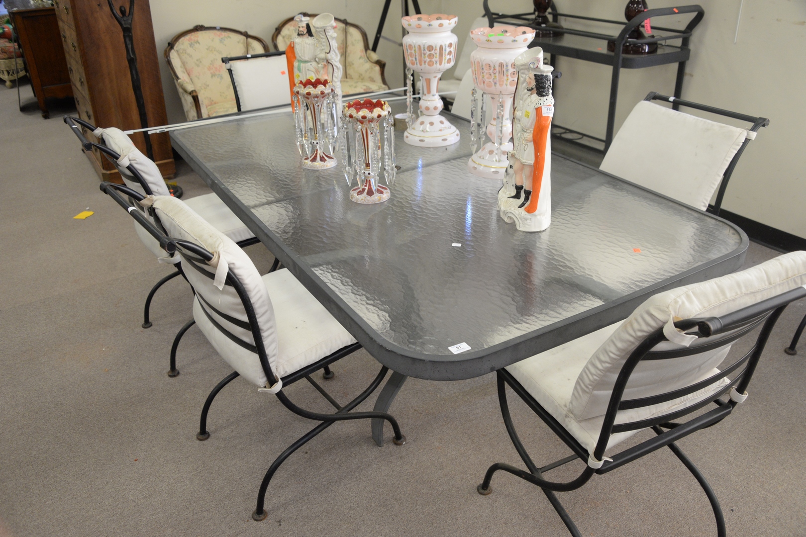 Eleven Piece Outdoor Patio Set, to include eight iron chairs with cushions, a glass top table, umbrella and a two tier cart, top 43″ x 81″.
