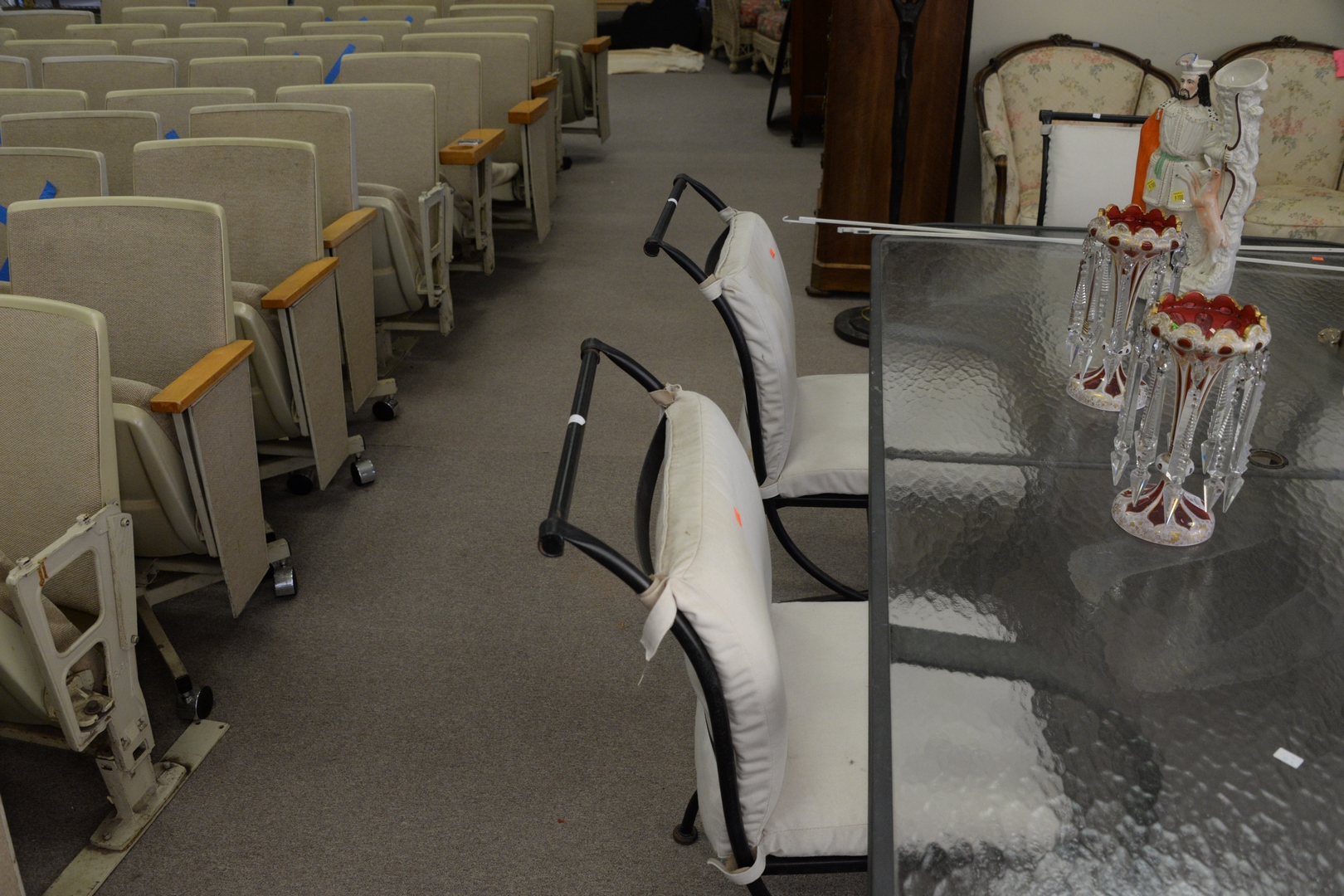 Lot 91: Eleven Piece Outdoor Patio Set, to include eight iron chairs with cushions, a glass top table, umbrella and a two tier cart, top 43″ x 81″.