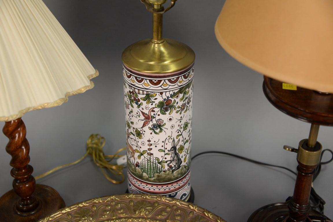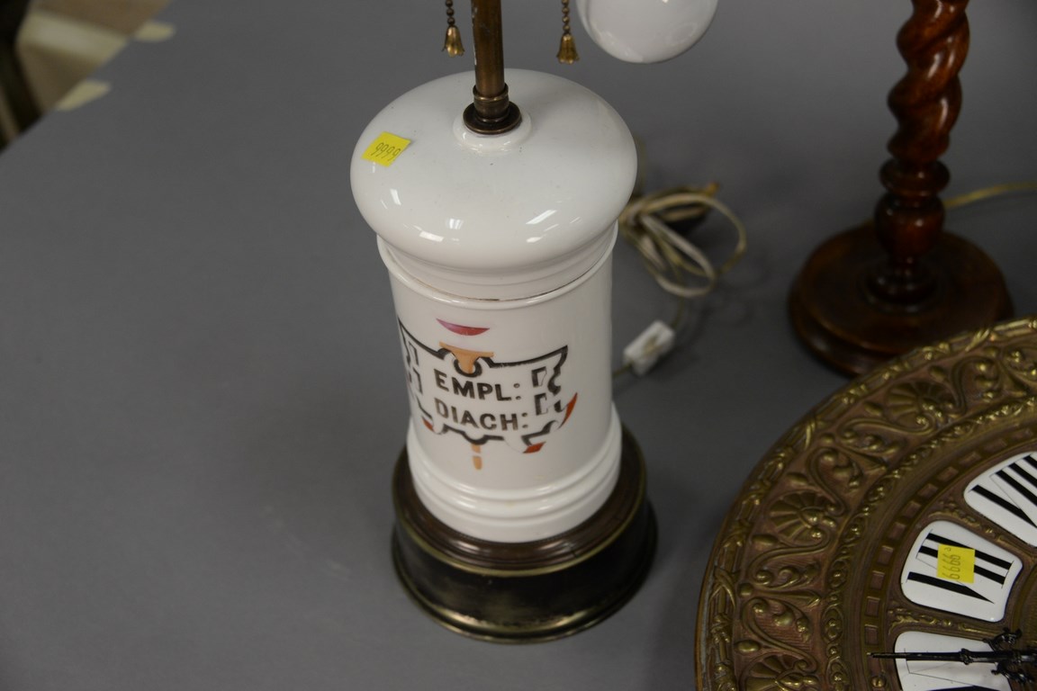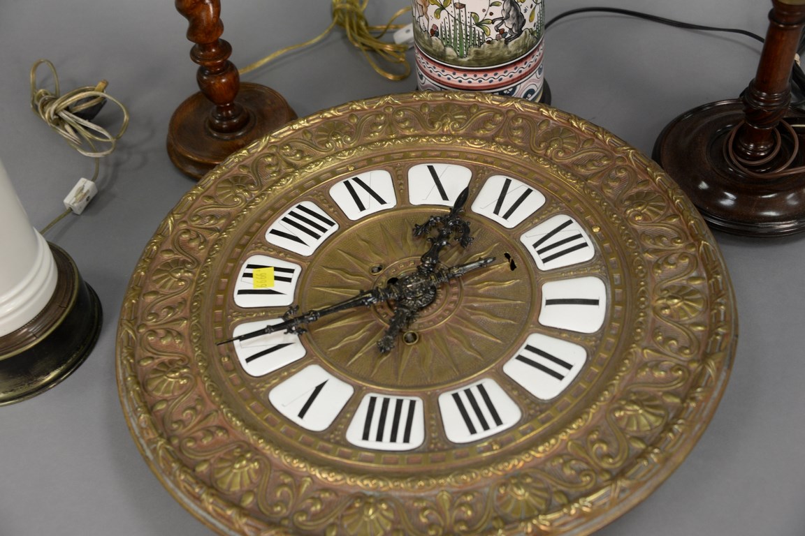Lot 91: Five piece lot to include a brass wall clock with enameled numbers, and four table lamps to include a twisted wood lamp, adjustable …