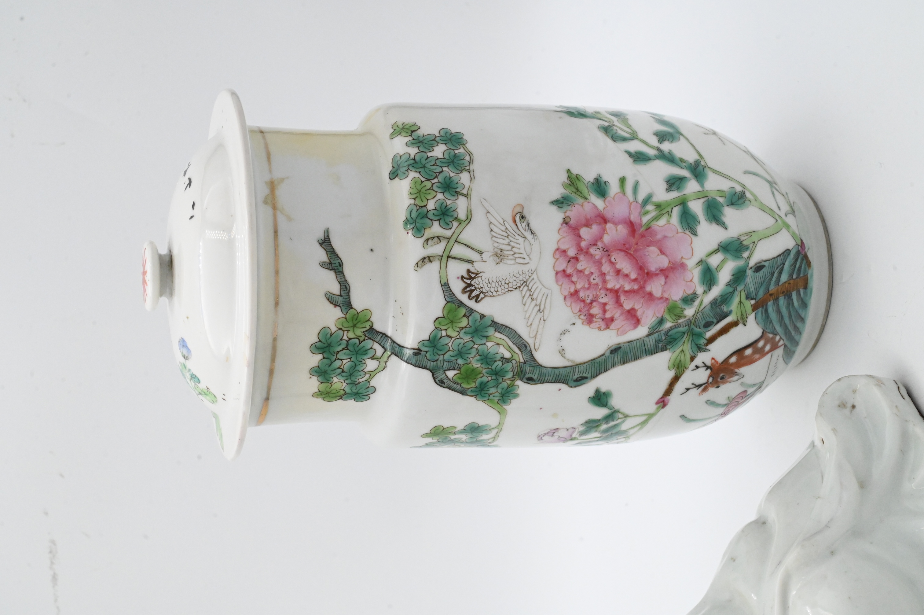 two covered jars, one with crane/heron, deer and flower motif, the other with scholars, footed dish with crashing waves and bird of paradise along with Guanyin goddess figure with child
