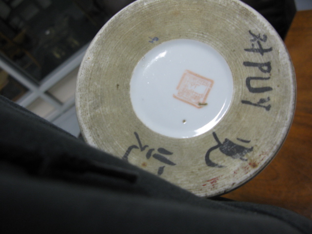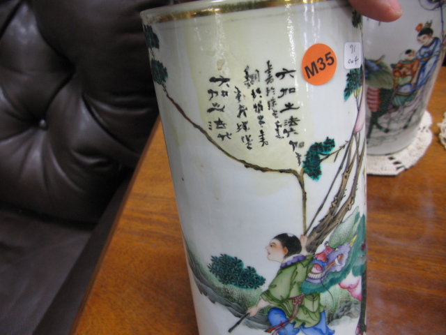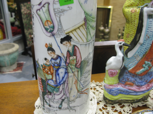 Four piece Chinese porcelain lot to include a figure, two vases, one as is, and a Chinese export plate.
