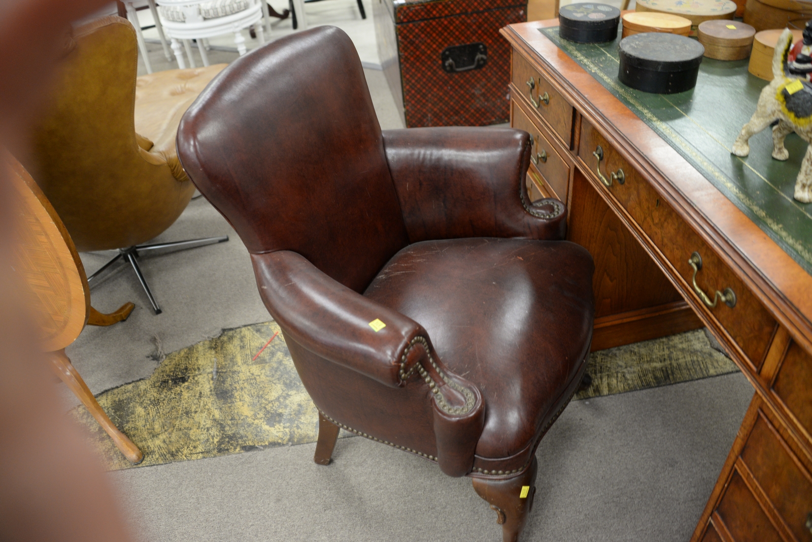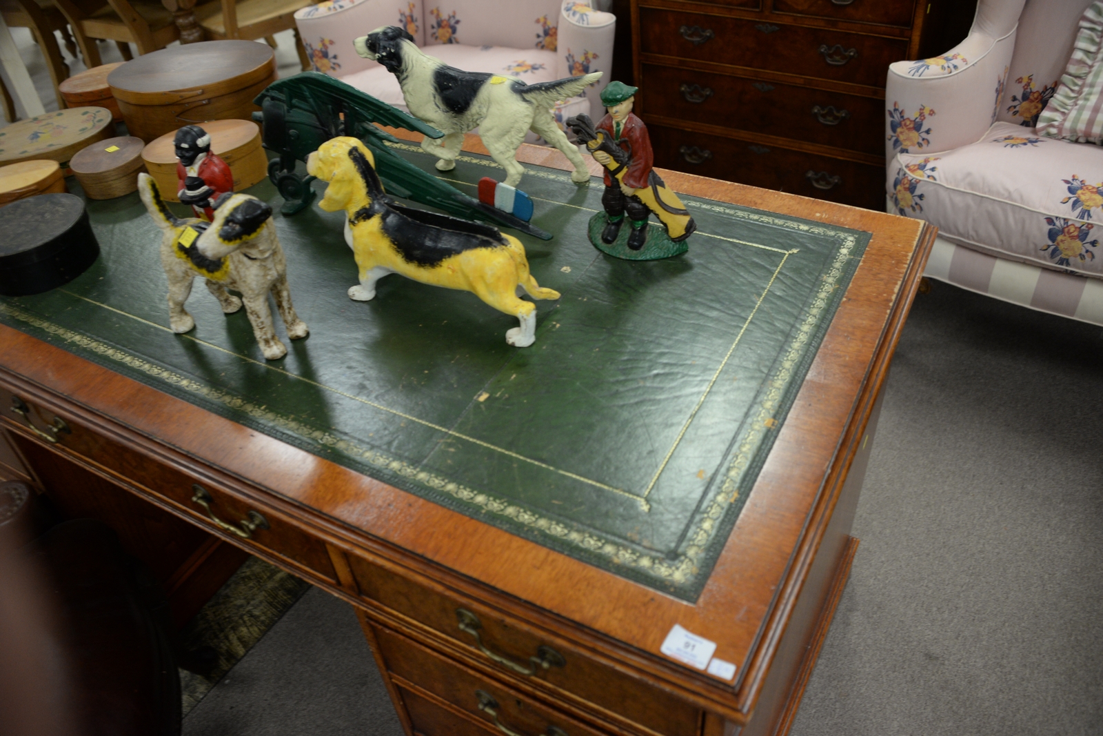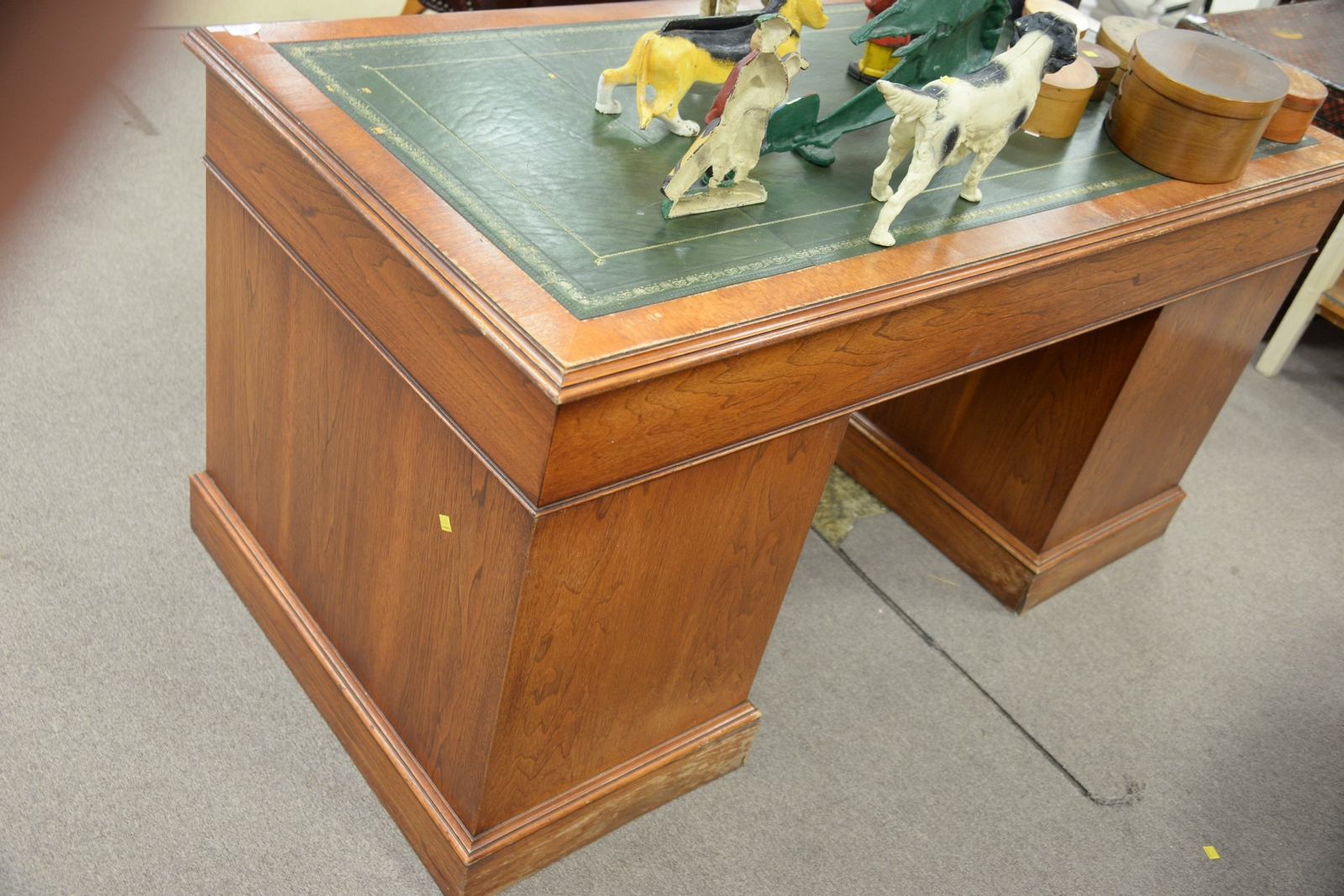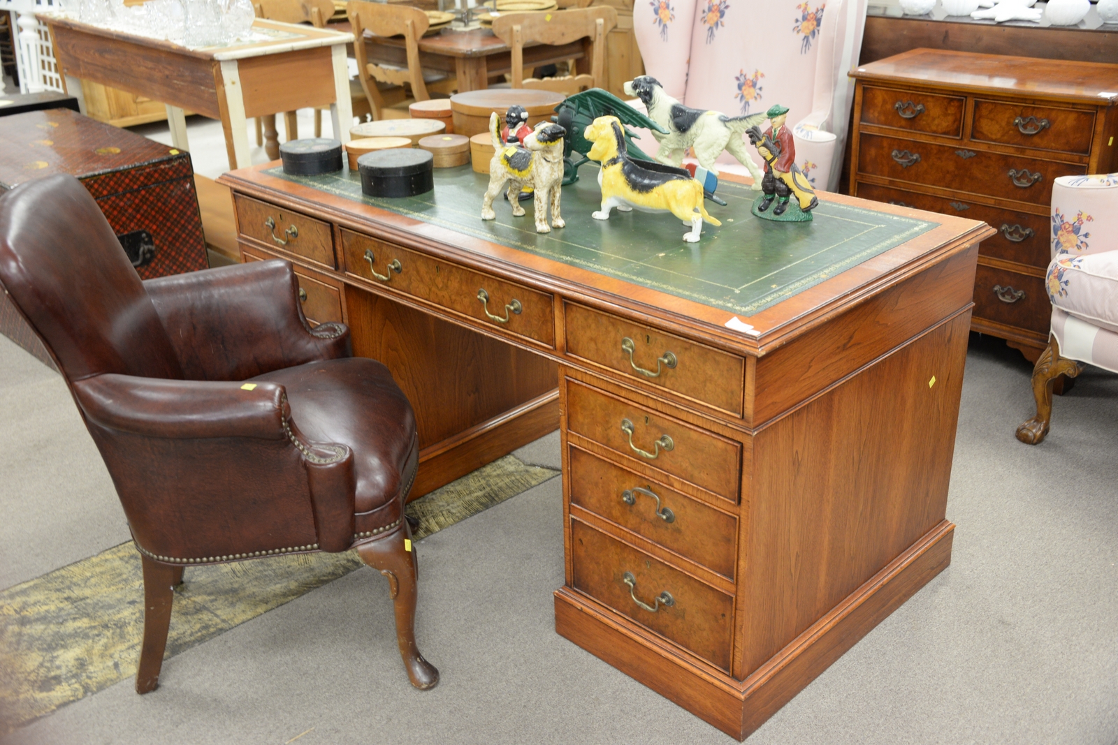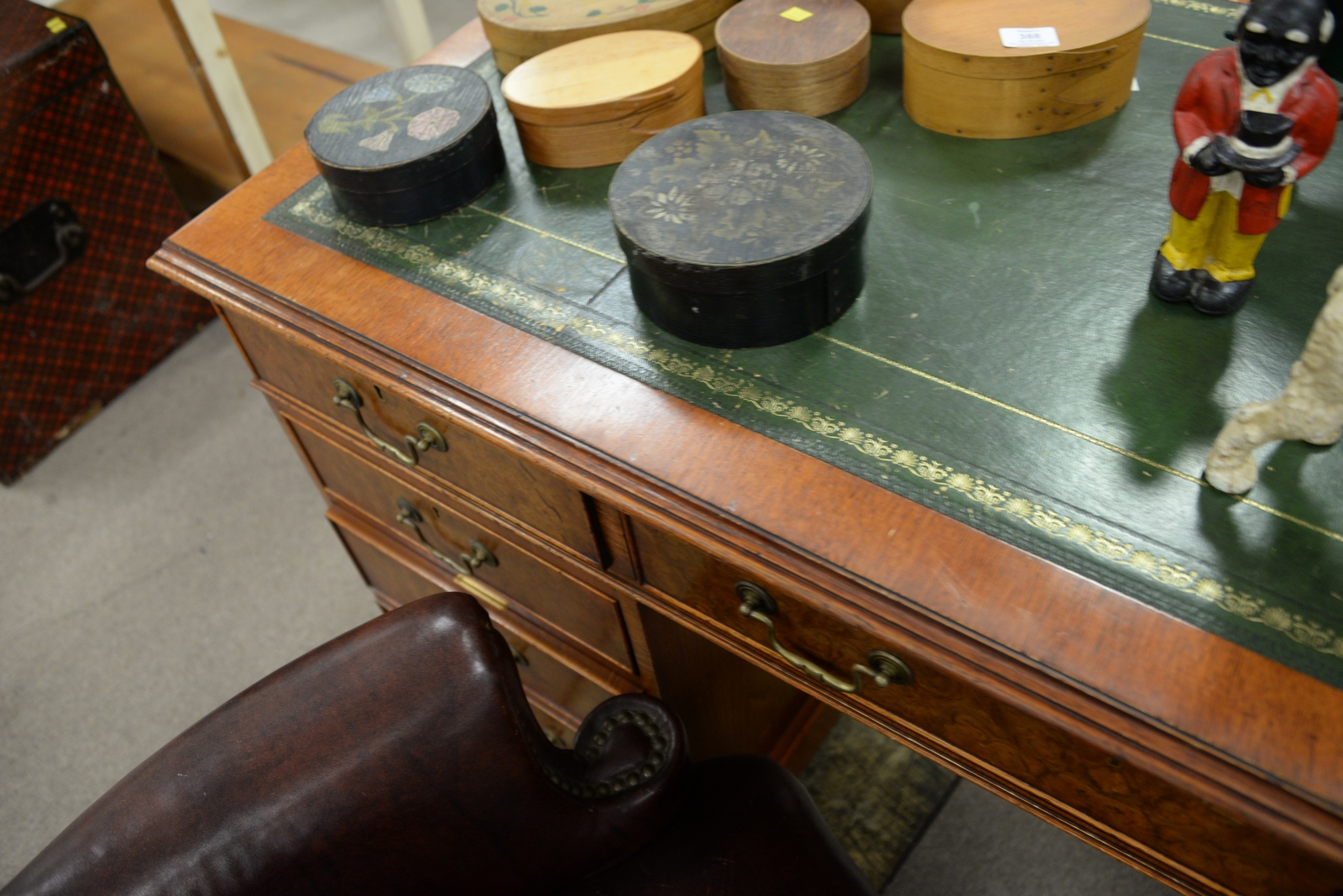 Lot 91: George IV style leather top desk in three parts with burlwood drawer fronts. ht. 31in., top: 30 x 62