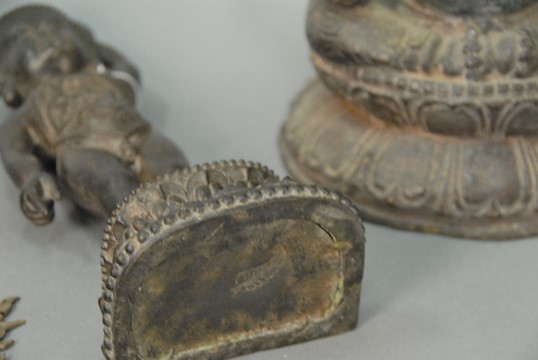 Lot 91: Group of seven small Oriental figures including a seated bronze Guanyin, ht. 8 1/2, bronze standing boy figures, h. 11, two mythol…