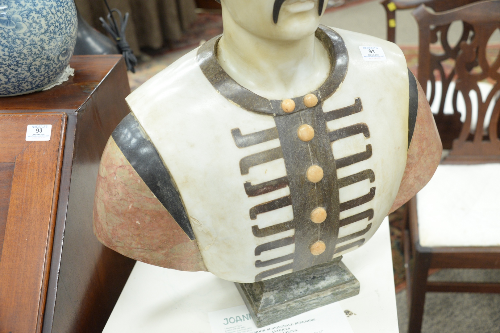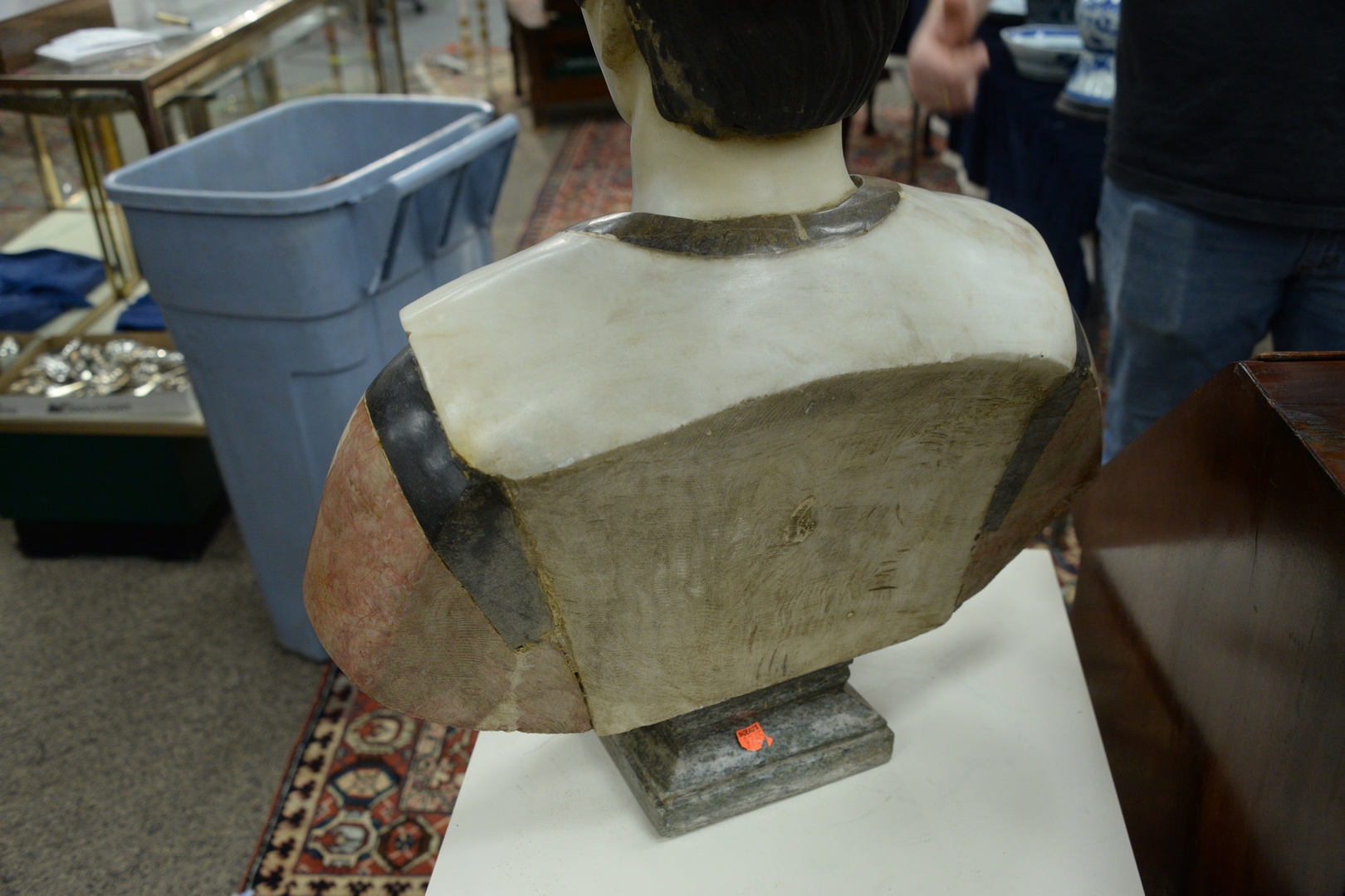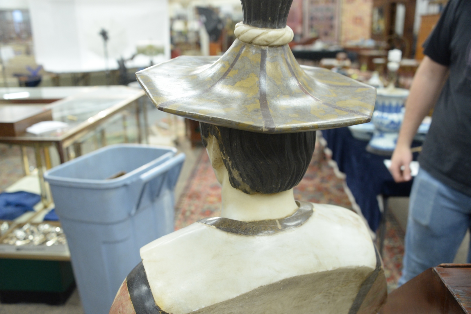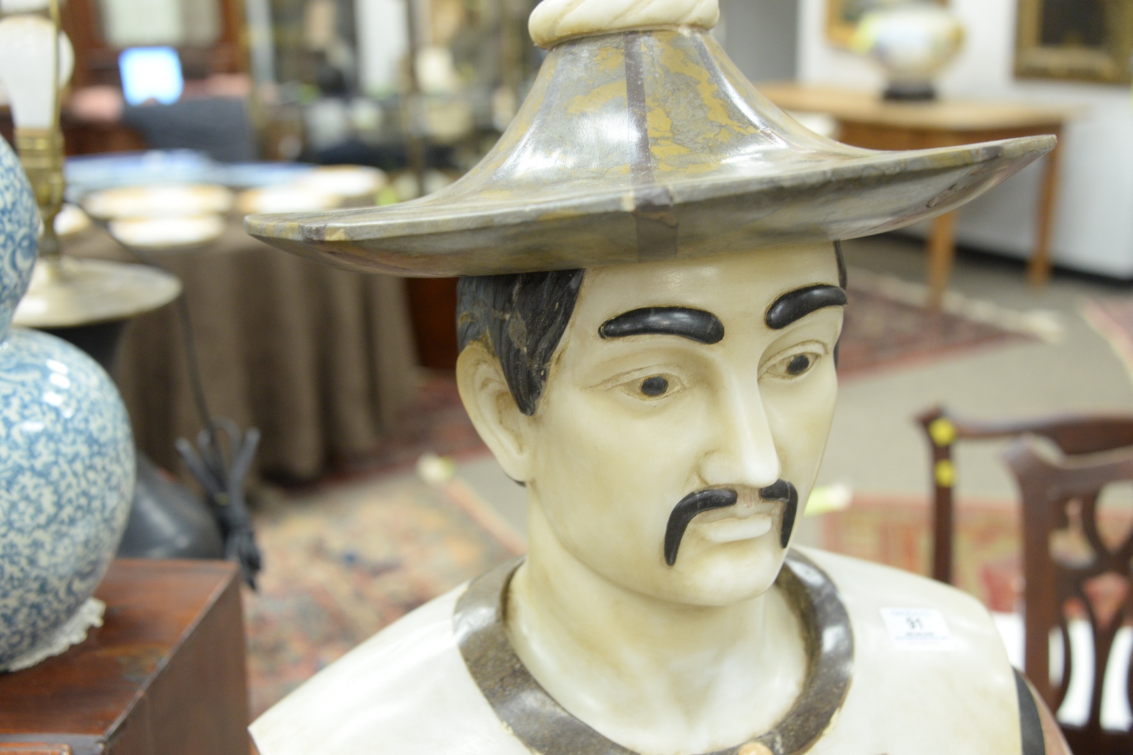 Lot 91: Italian White and Variegated Marble Bust of an Asian Man with Hat, height 30 inches, width 22 inches. Provenance: Christie’s, South Kensington, Wednesday, September 27, 2000. Collection from Mr. and Mrs. Fowler, West Hartford, Connecticut.