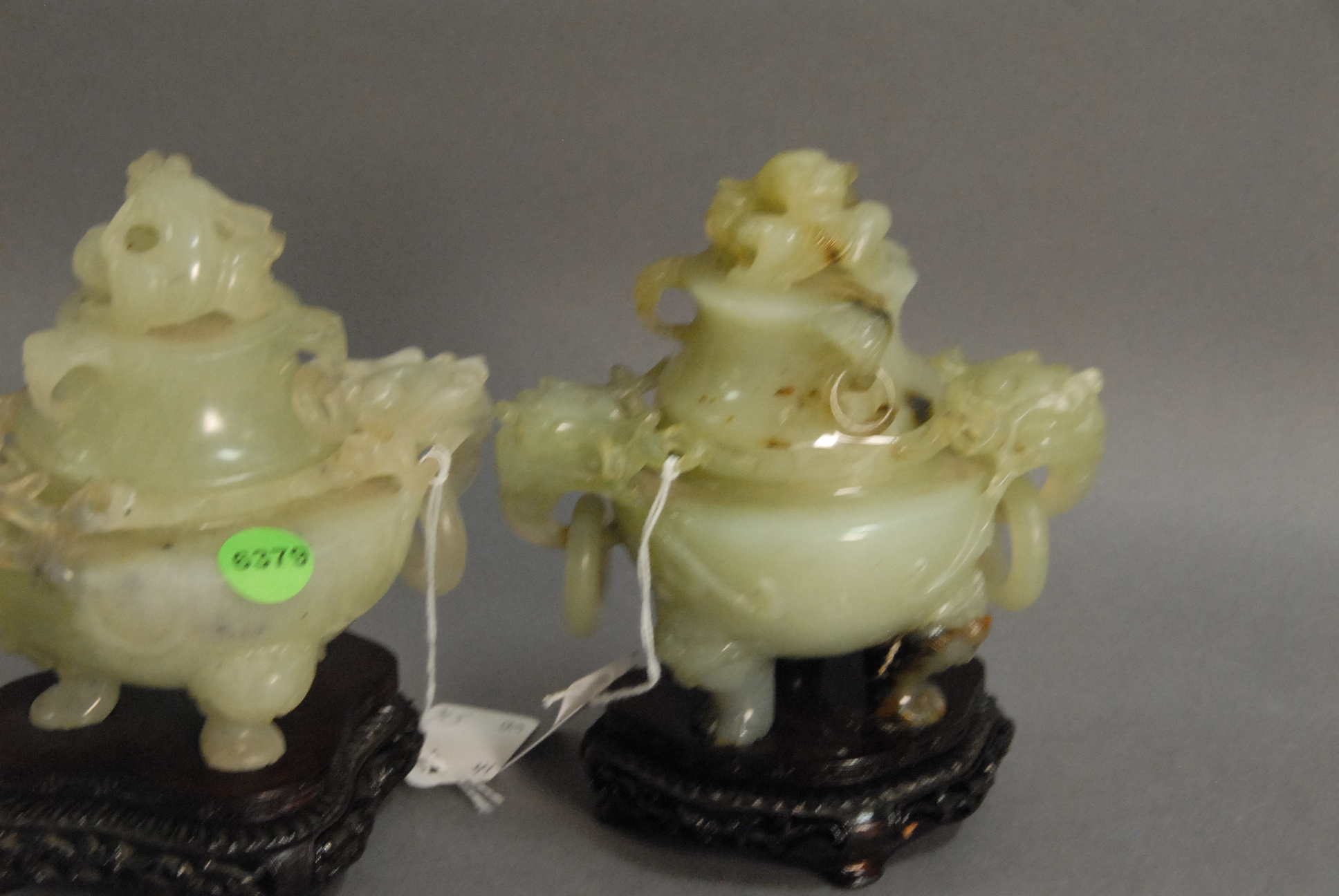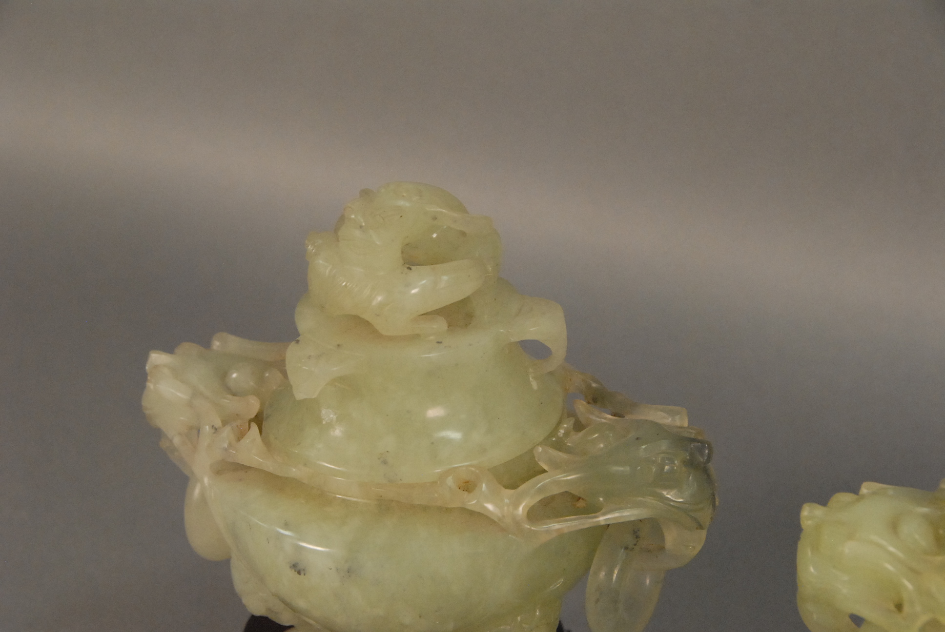 Pair of carved celadon jade foo dog covered urns having three footed vase, reticulated carved foo dog head handles with loose rings and having foo dog finial on the cover, ht. 5 1/4, wd. 5 1/2 on carved wooden stands.
