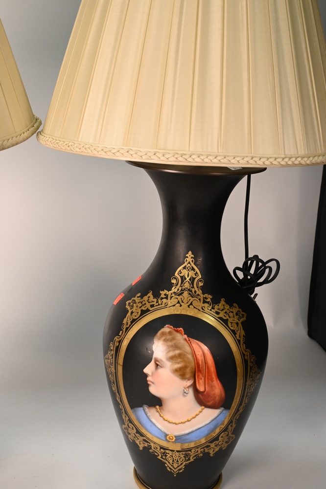 Pair of Paris Porcelain Portrait Vases, made into table lamps, one with old repair, one with hairline, total height 33 inches.