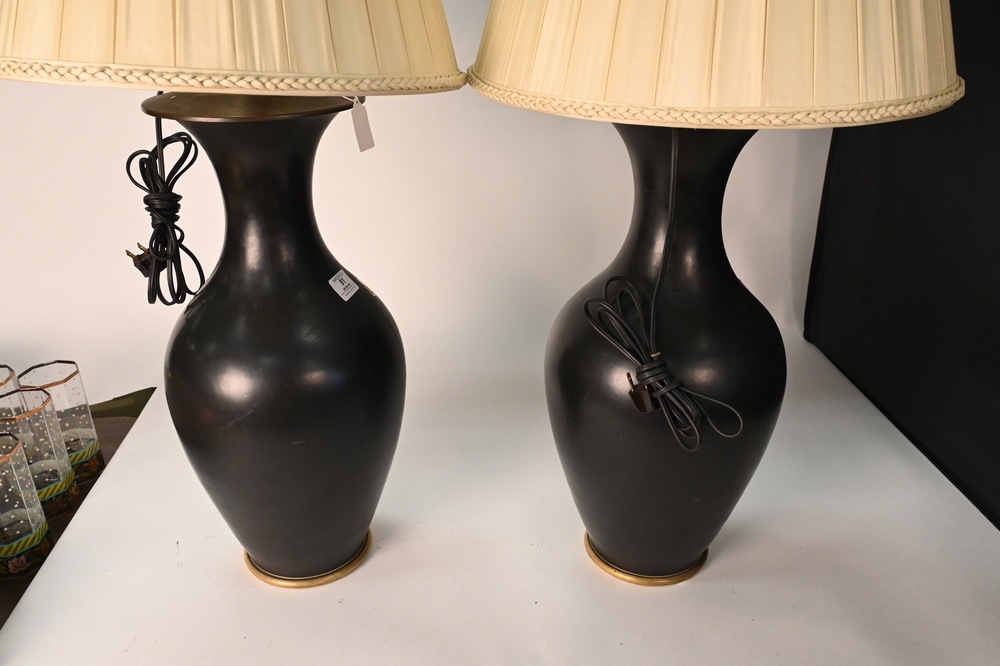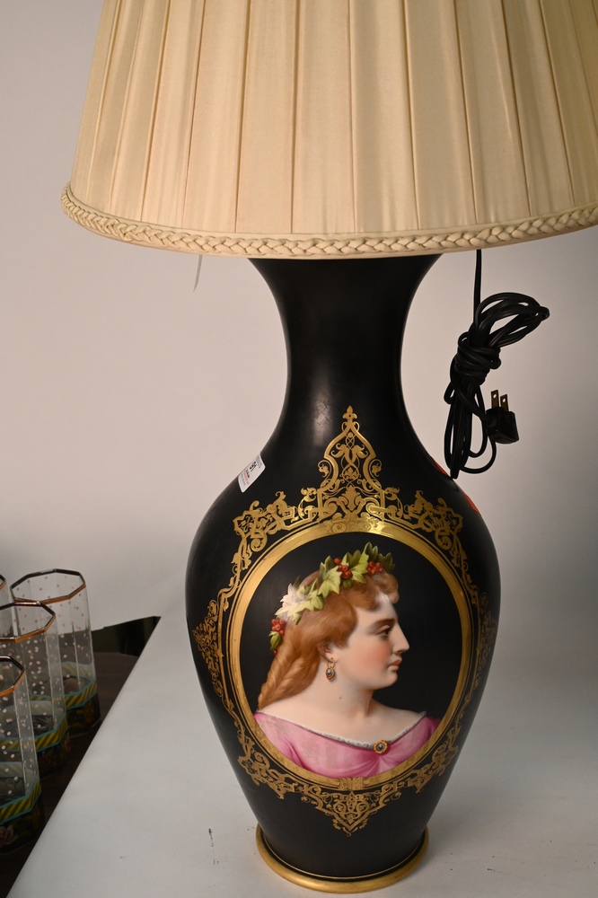 Lot 91: Pair of Paris Porcelain Portrait Vases, made into table lamps, one with old repair, one with hairline, total height 33 inches.