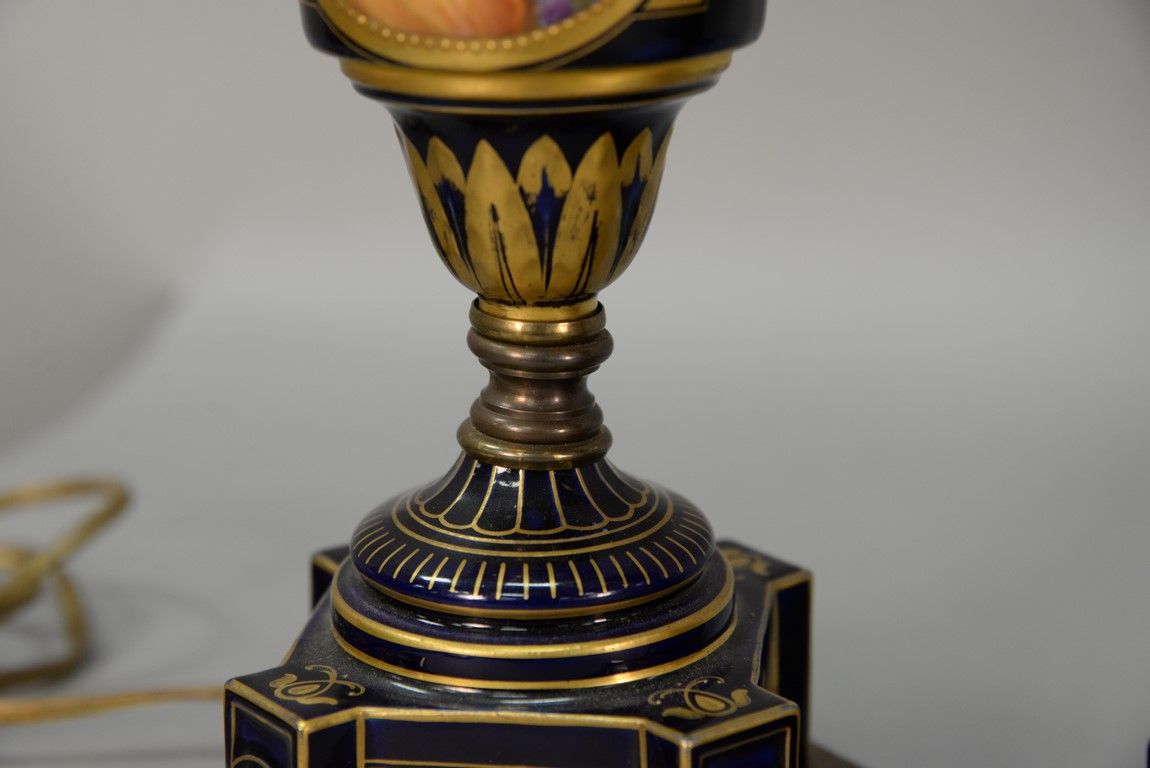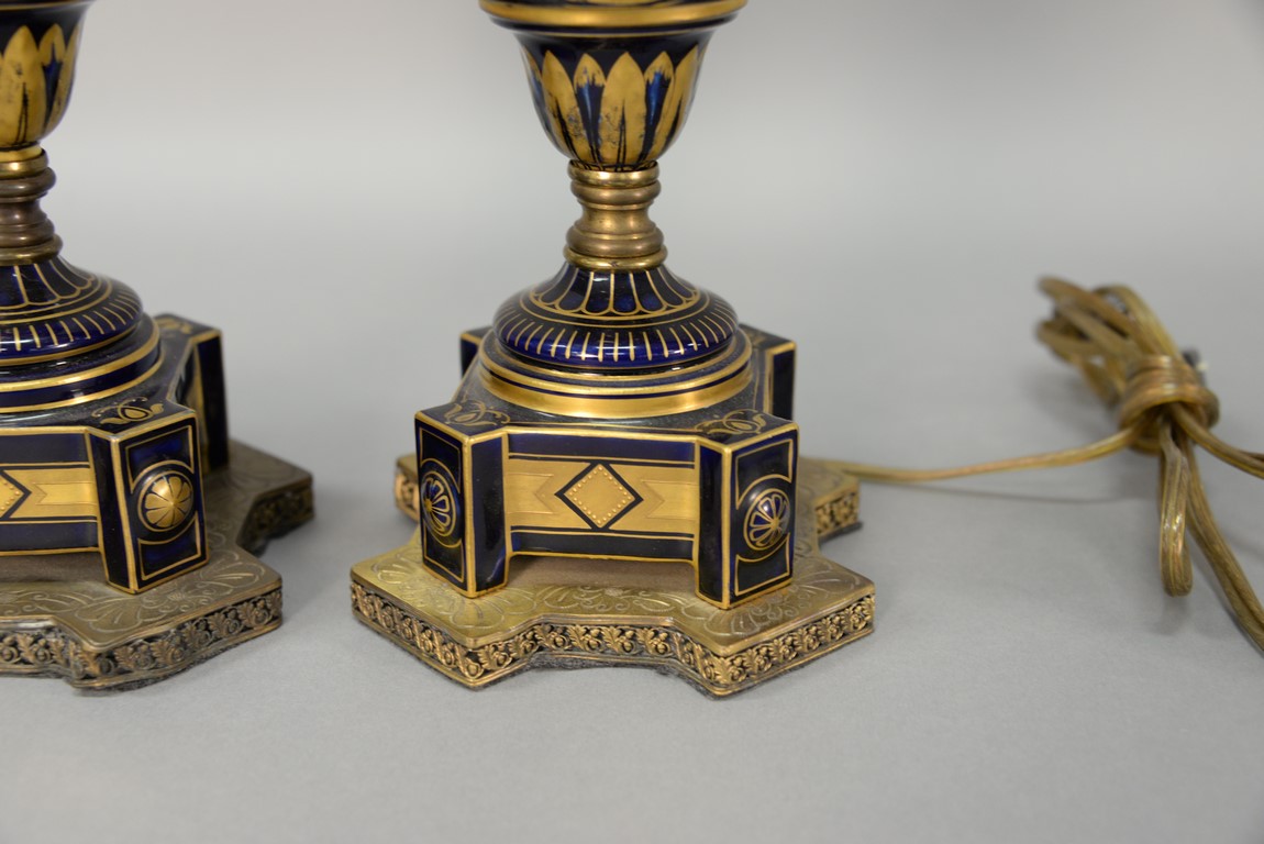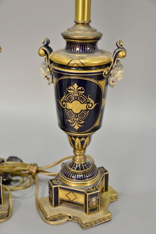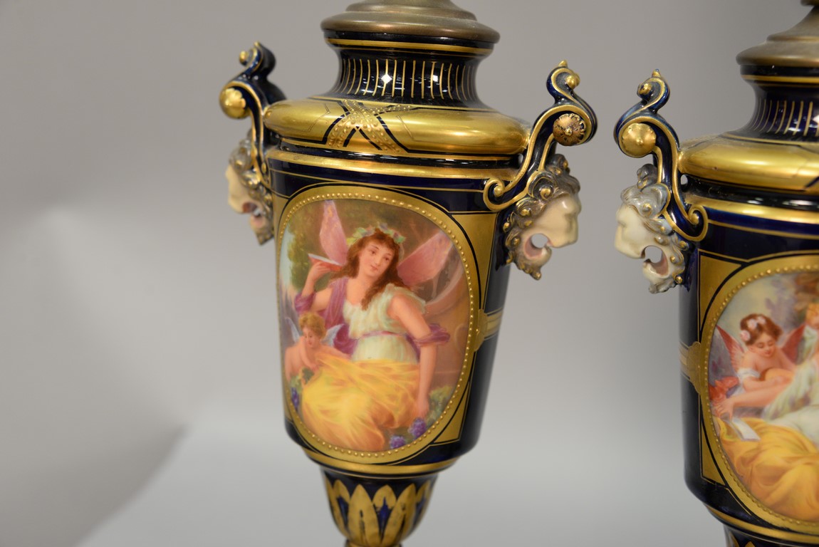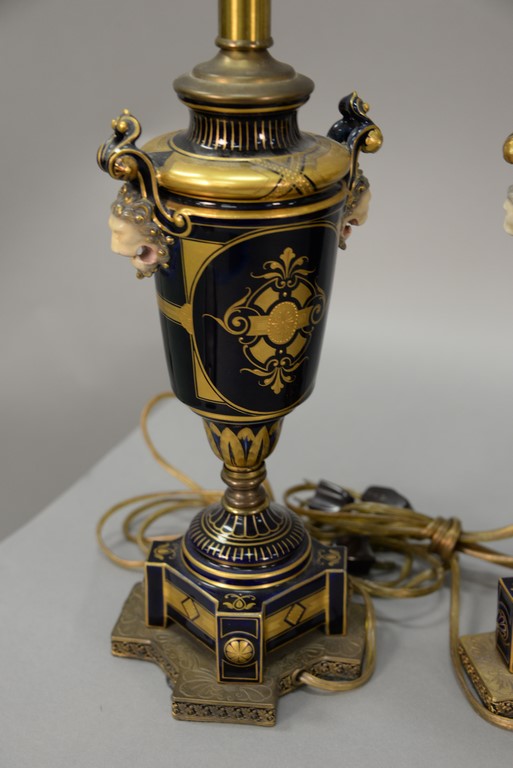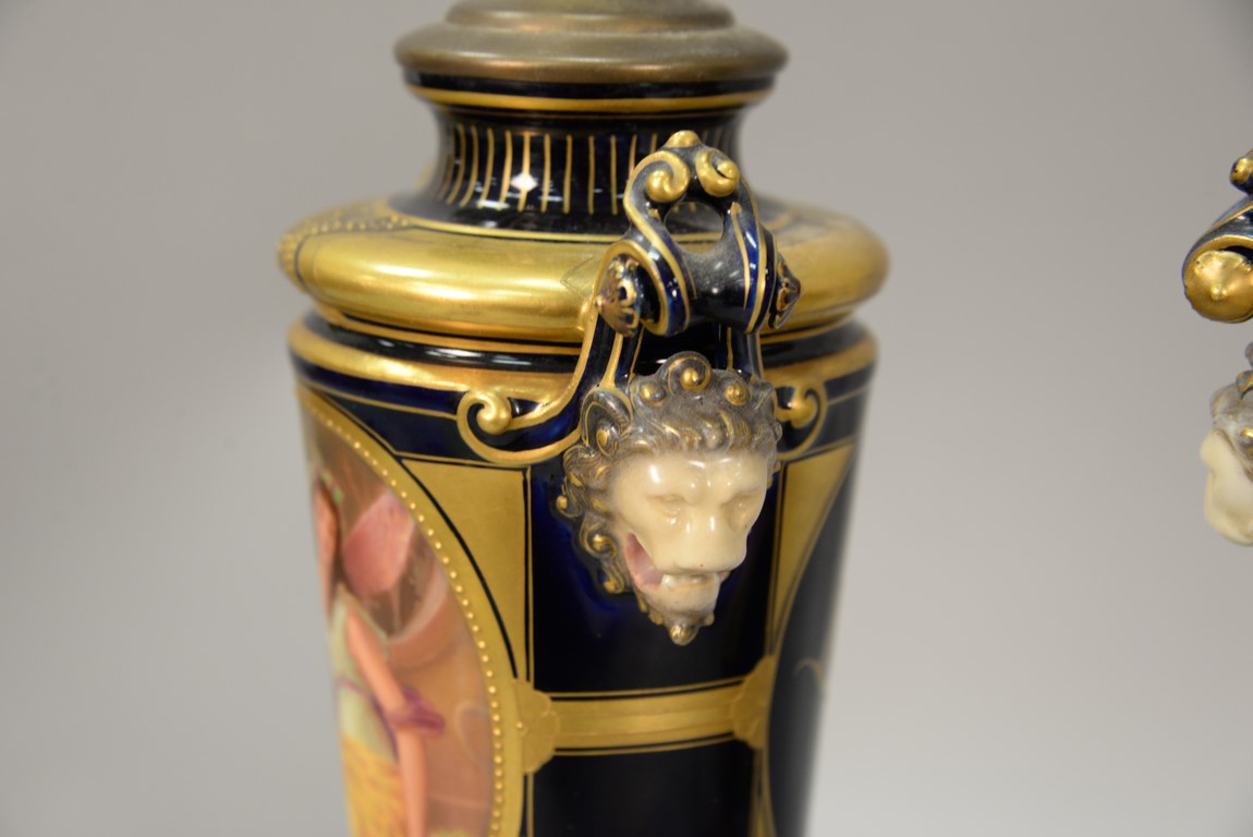 Lot 91: Pair of Royal Vienna urns made into table lamps, each with lion mask scroll handles and painted panels, marked with blue beehive, on…