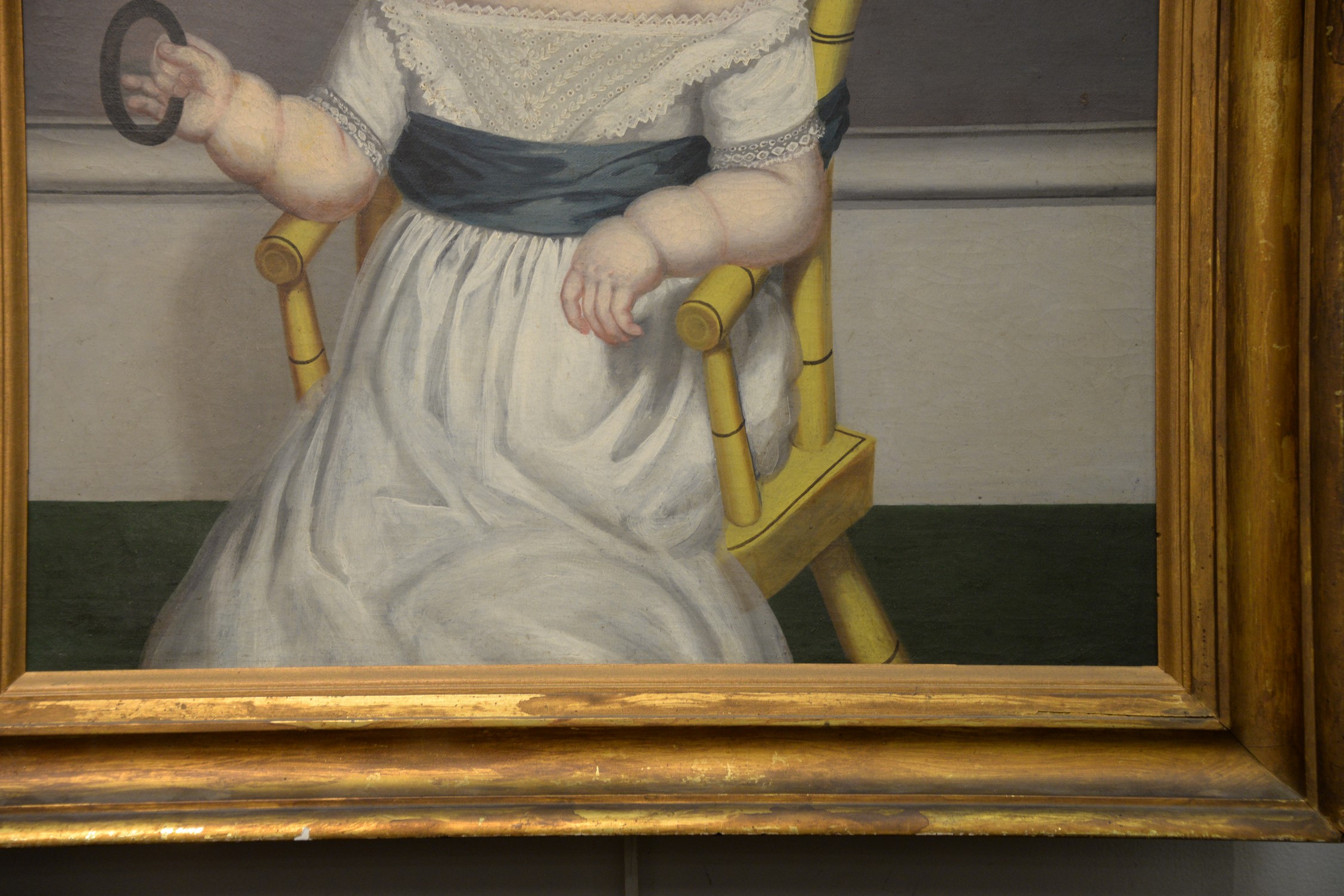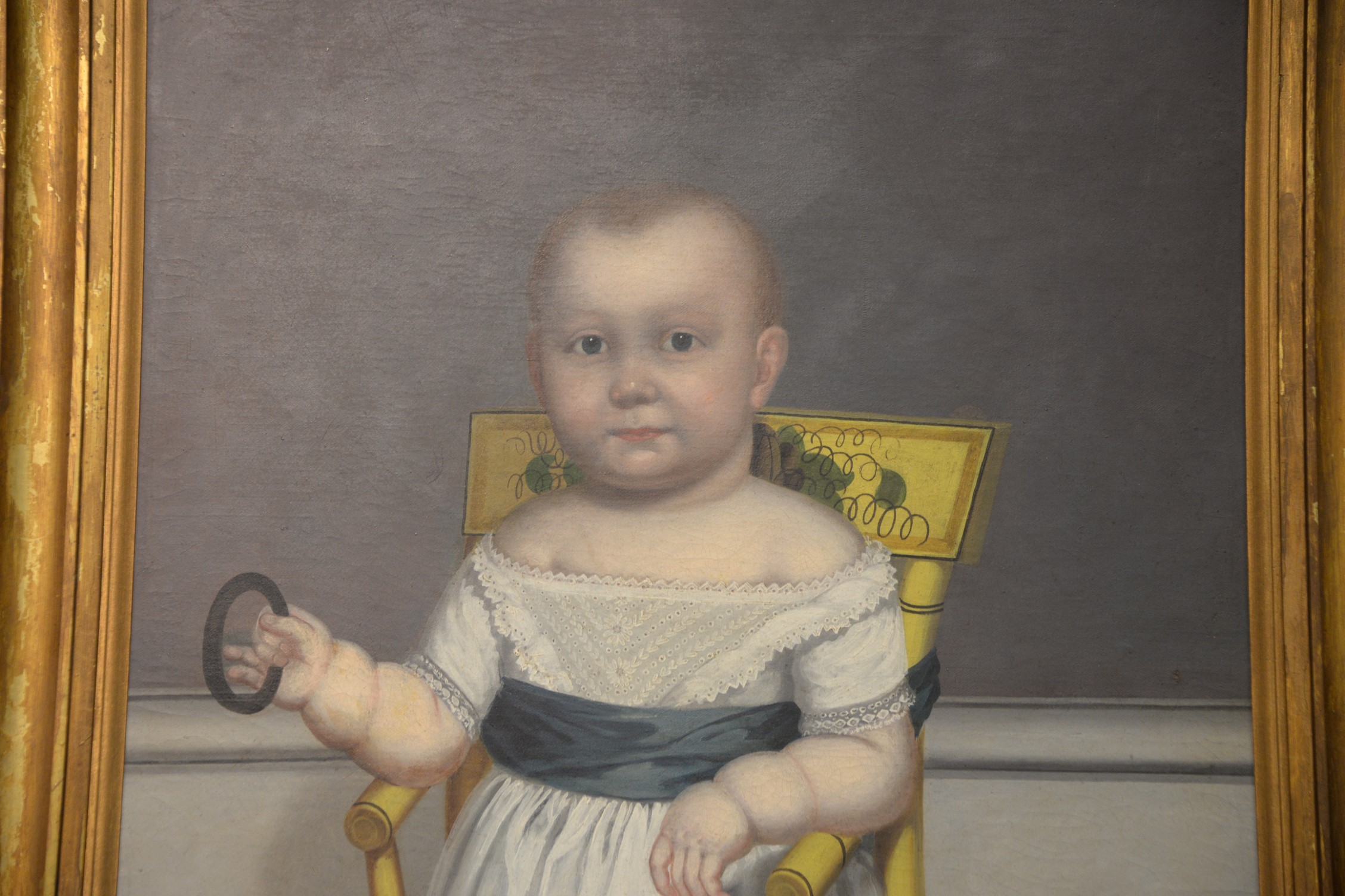 Lot 91: Portrait of a Baby seated in a yellow stenciled Federal chair holding a rattle oil on canvas unsigned American School, 19th…