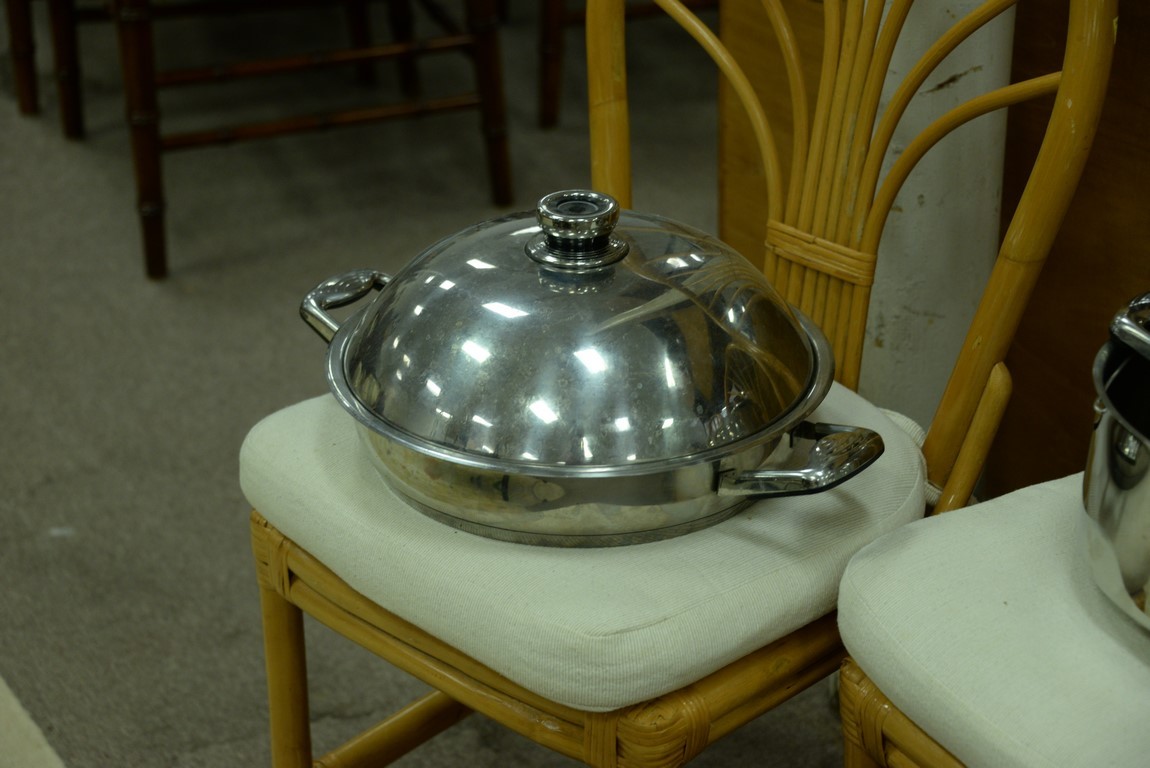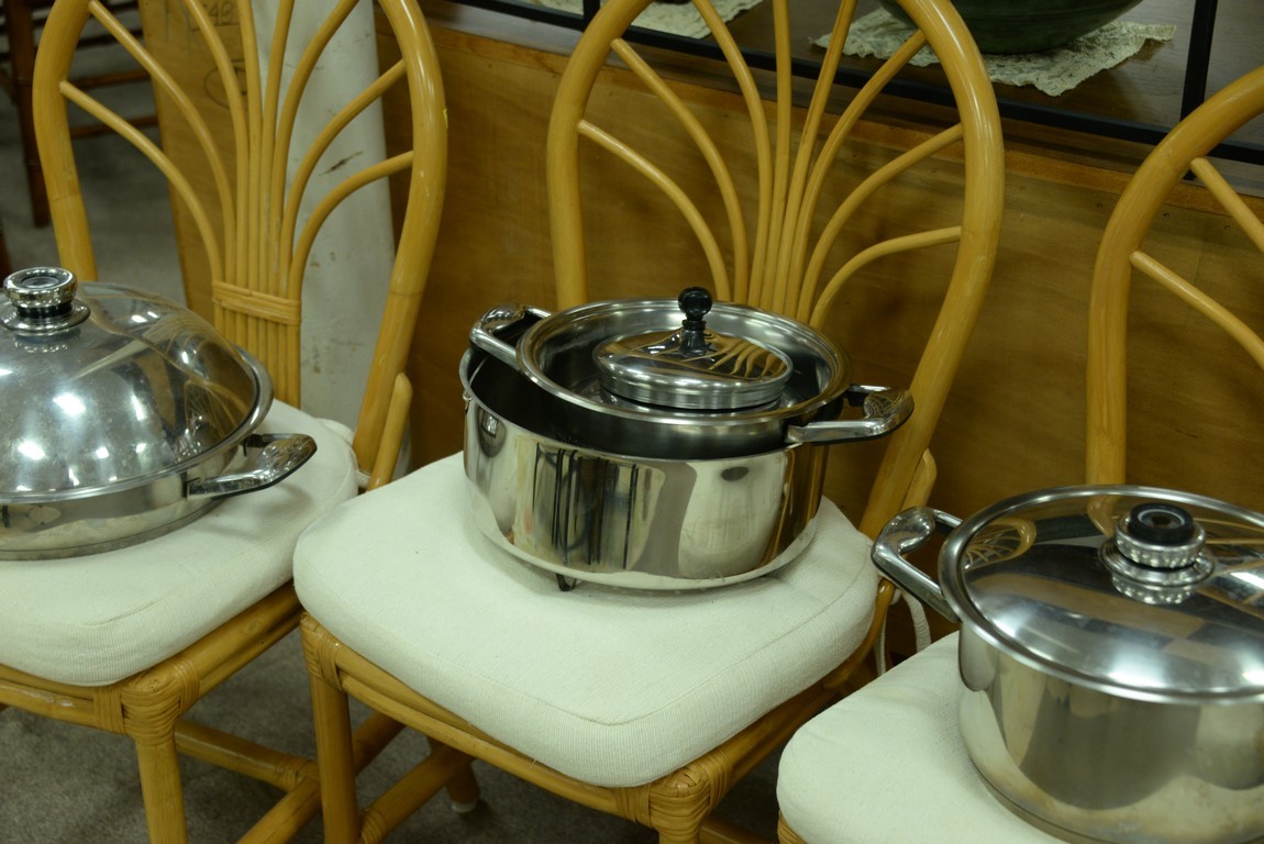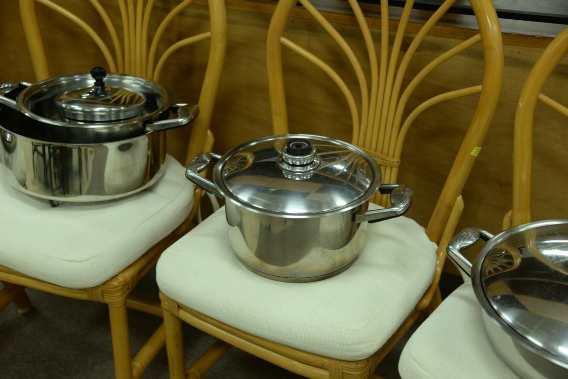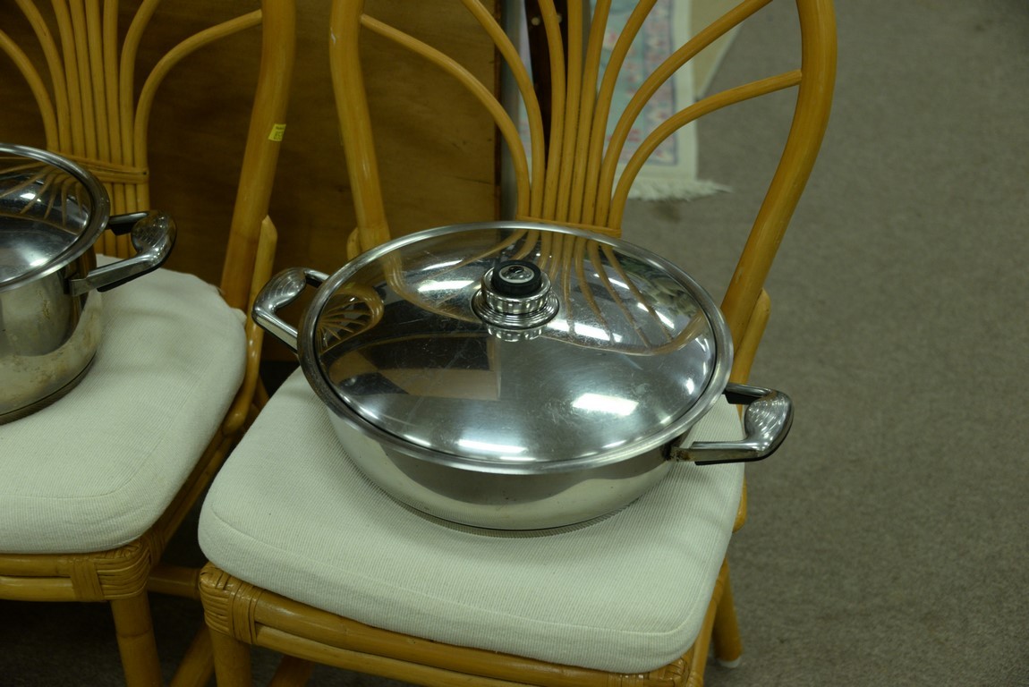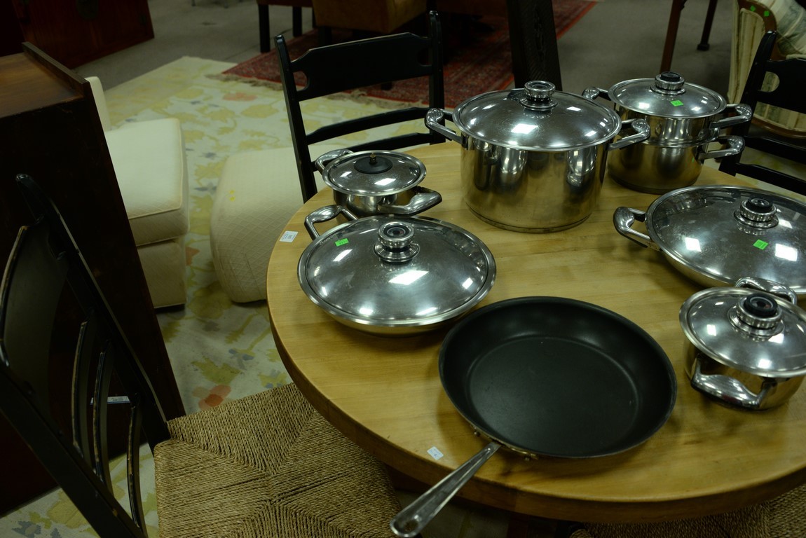 Lot 91: Set of thirteen Professional Platinum Cooking System pots and pans, stainless.