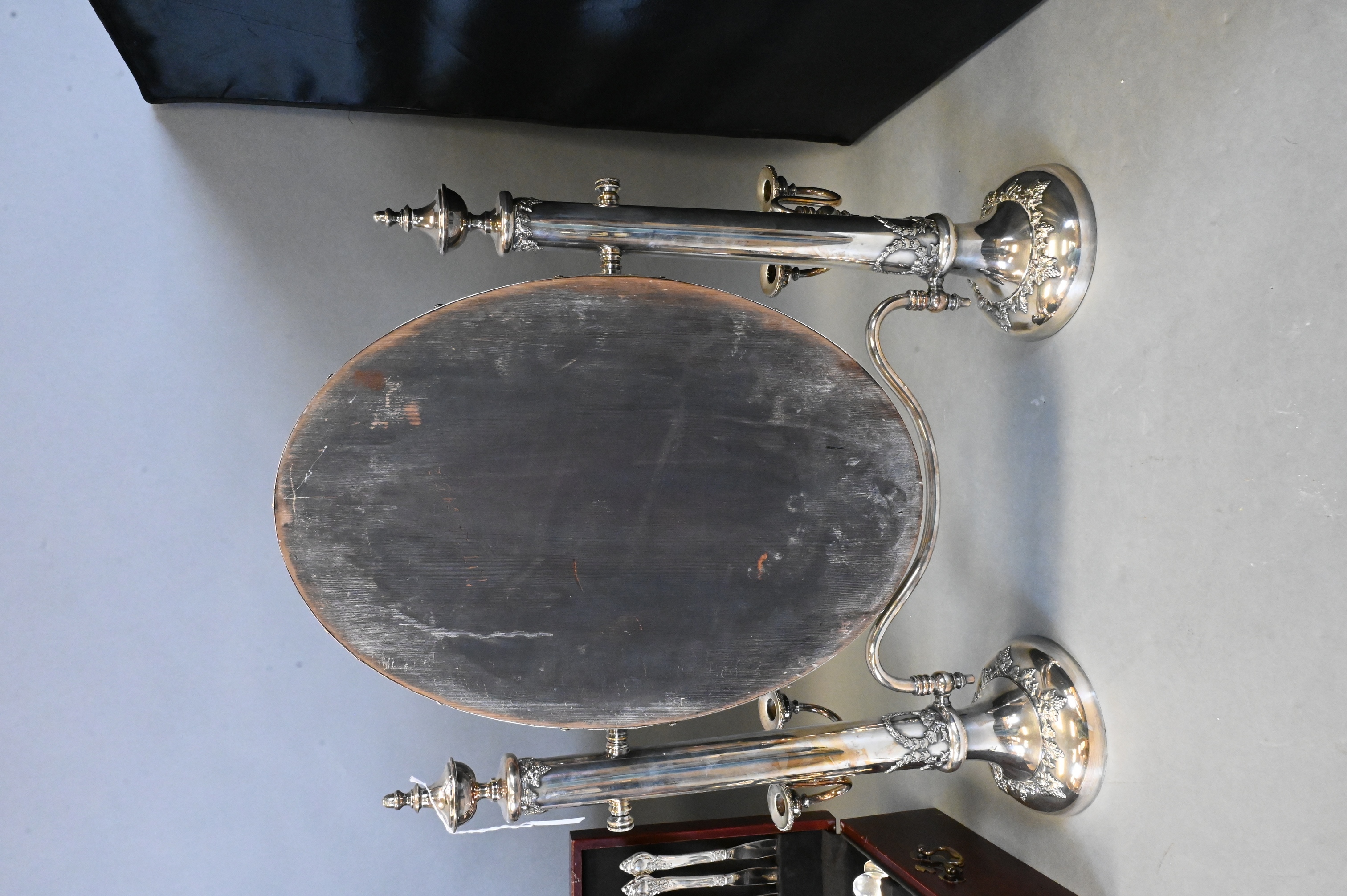 swiveling oval mirror flanked by two column form and articulating two armed candelabras accented with grape vine and laurel wreath motif, hallmarks on mirror, early 20th century