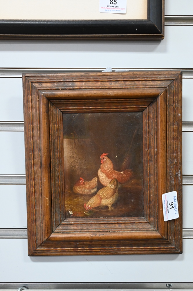 Lot 91: Three Chickens in Barn, oil on board, initialed lower left A.J., William Doyle Galleries label on back, 6″ x 4 1/2″.
