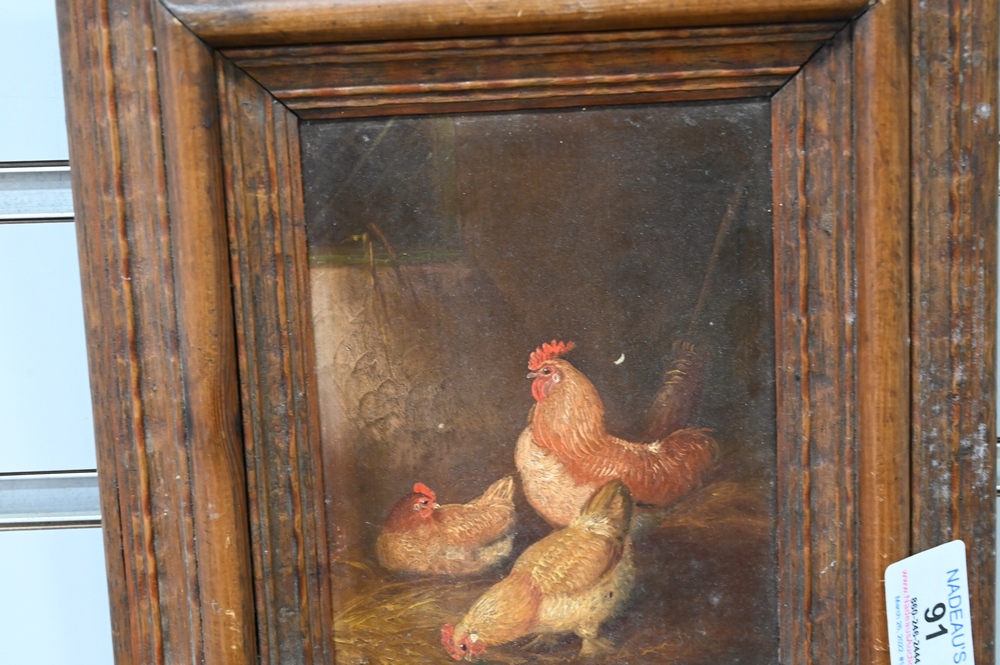 Three Chickens in Barn, oil on board, initialed lower left A.J., William Doyle Galleries label on back, 6″ x 4 1/2″.