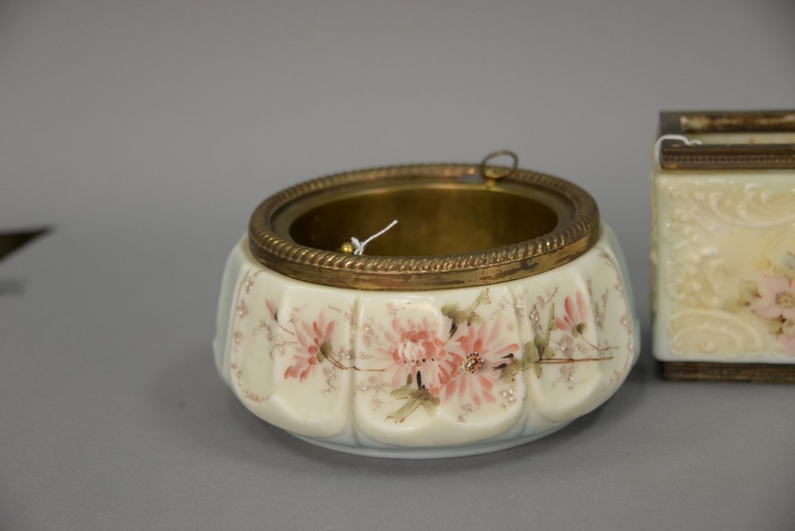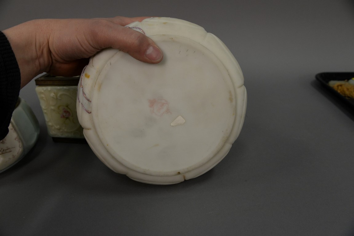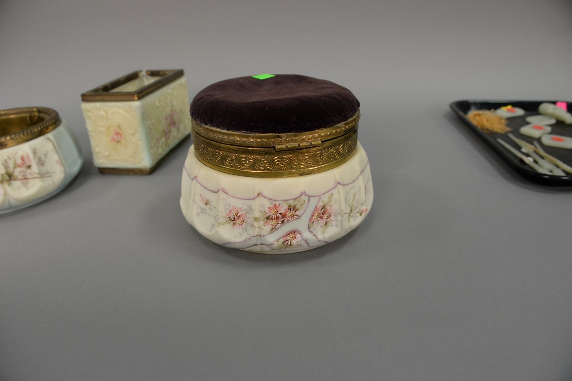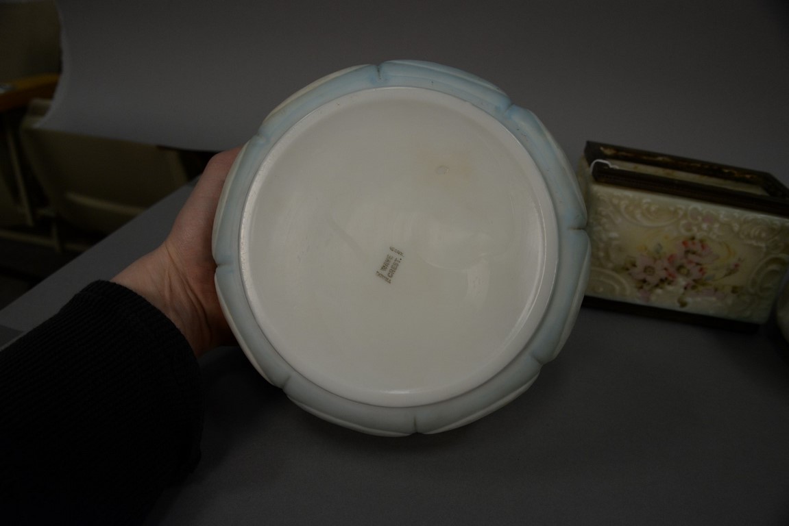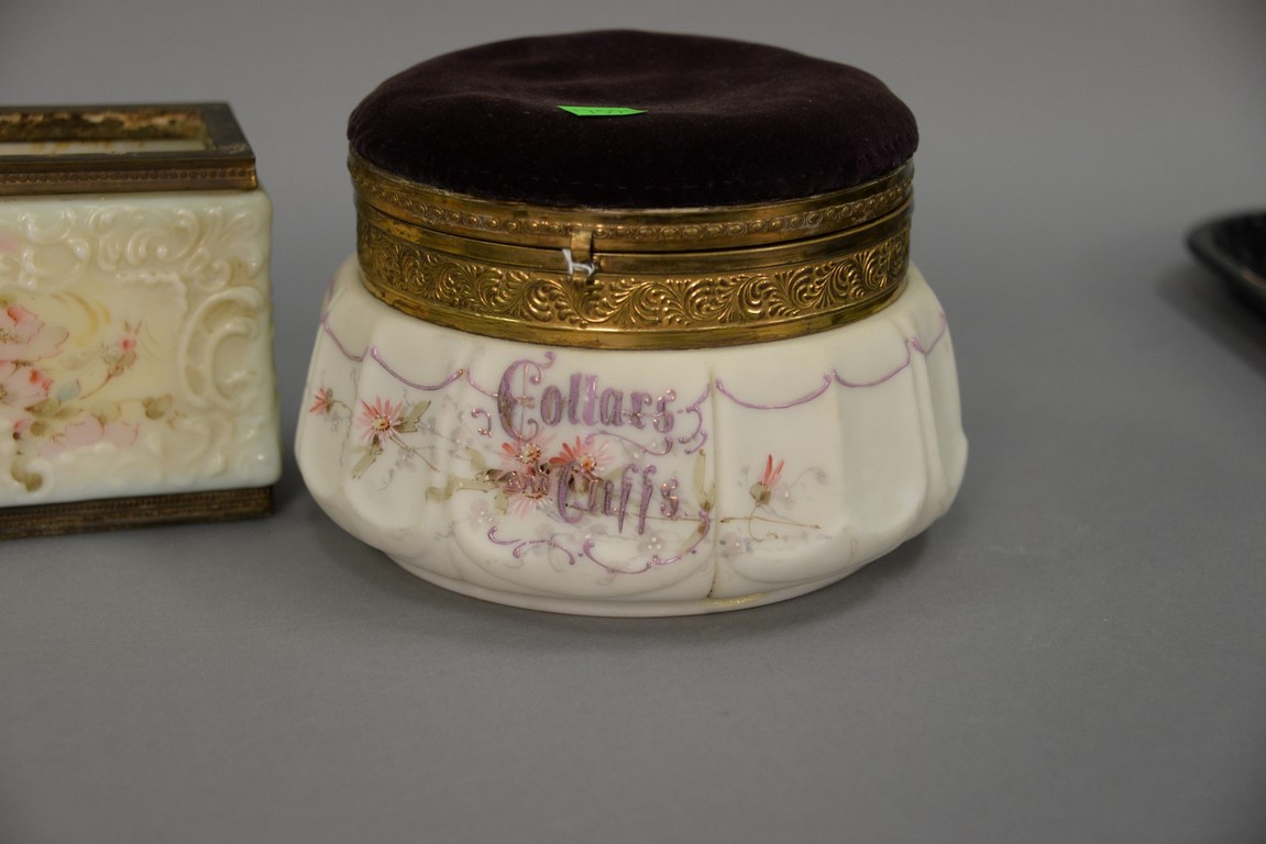 Lot 91: Three large Victorian Wavecrest pieces including collars and cuffs dresser box with cushion top, ht. 5 1/4 in., dia. 7 3/4 in. a la…