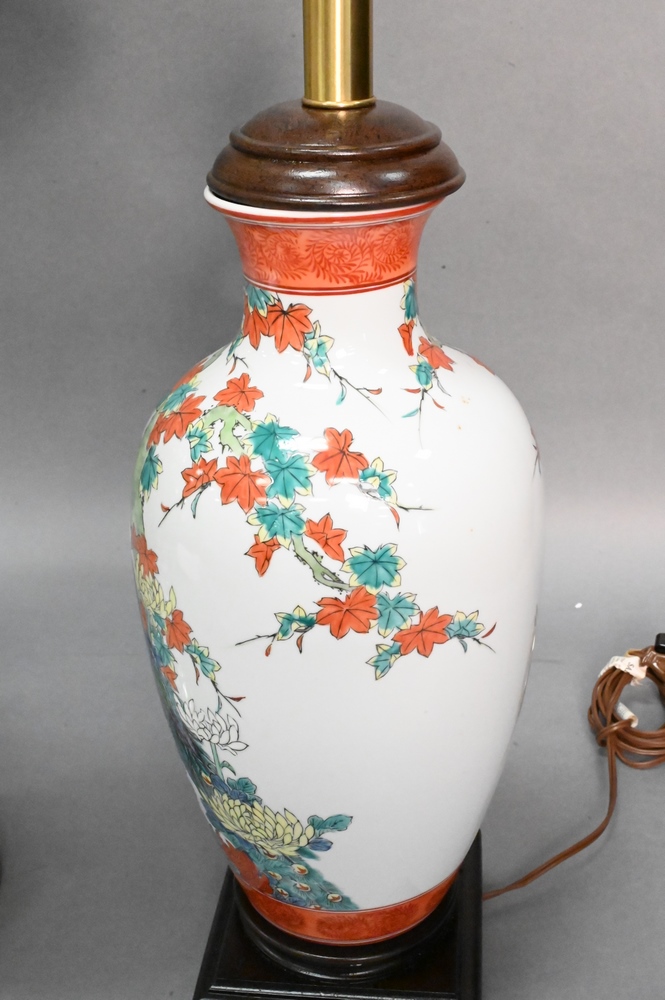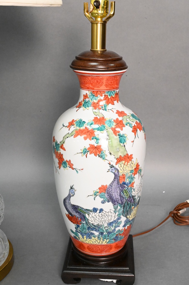 Lot 91: Three Piece Lot, having two table lamps to include a large Waterford crystal and a porcelain Oriental style, tallest 34 1/2 inches; along with a large glass tray; 35 inches. Provenance: Collections of Norma Reilly, New Jersey.