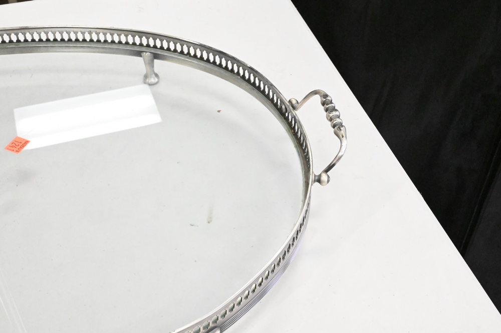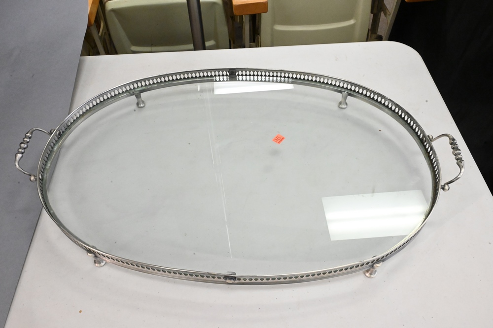 Three Piece Lot, having two table lamps to include a large Waterford crystal and a porcelain Oriental style, tallest 34 1/2 inches; along with a large glass tray; 35 inches. Provenance: Collections of Norma Reilly, New Jersey.