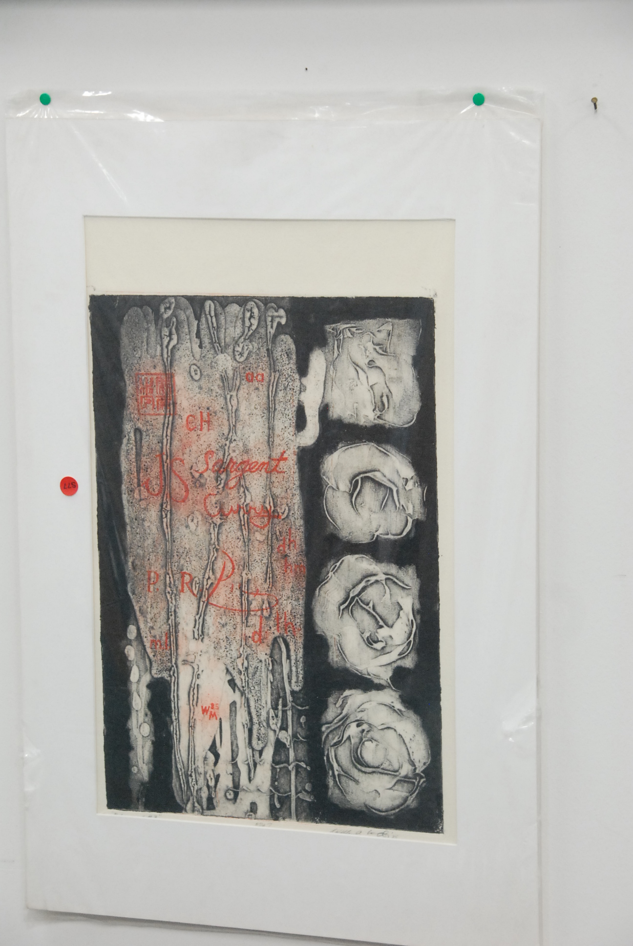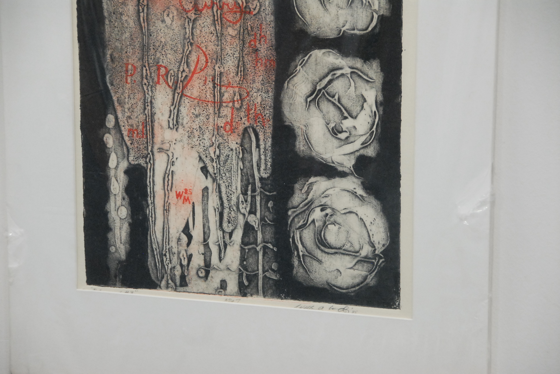 Two signed William McCloy collographs, one is Palimsest #3 1985 black and white with red letters Ch JS Sargent Curry , the other is Ladder #10: The Ten Rungs 1983.