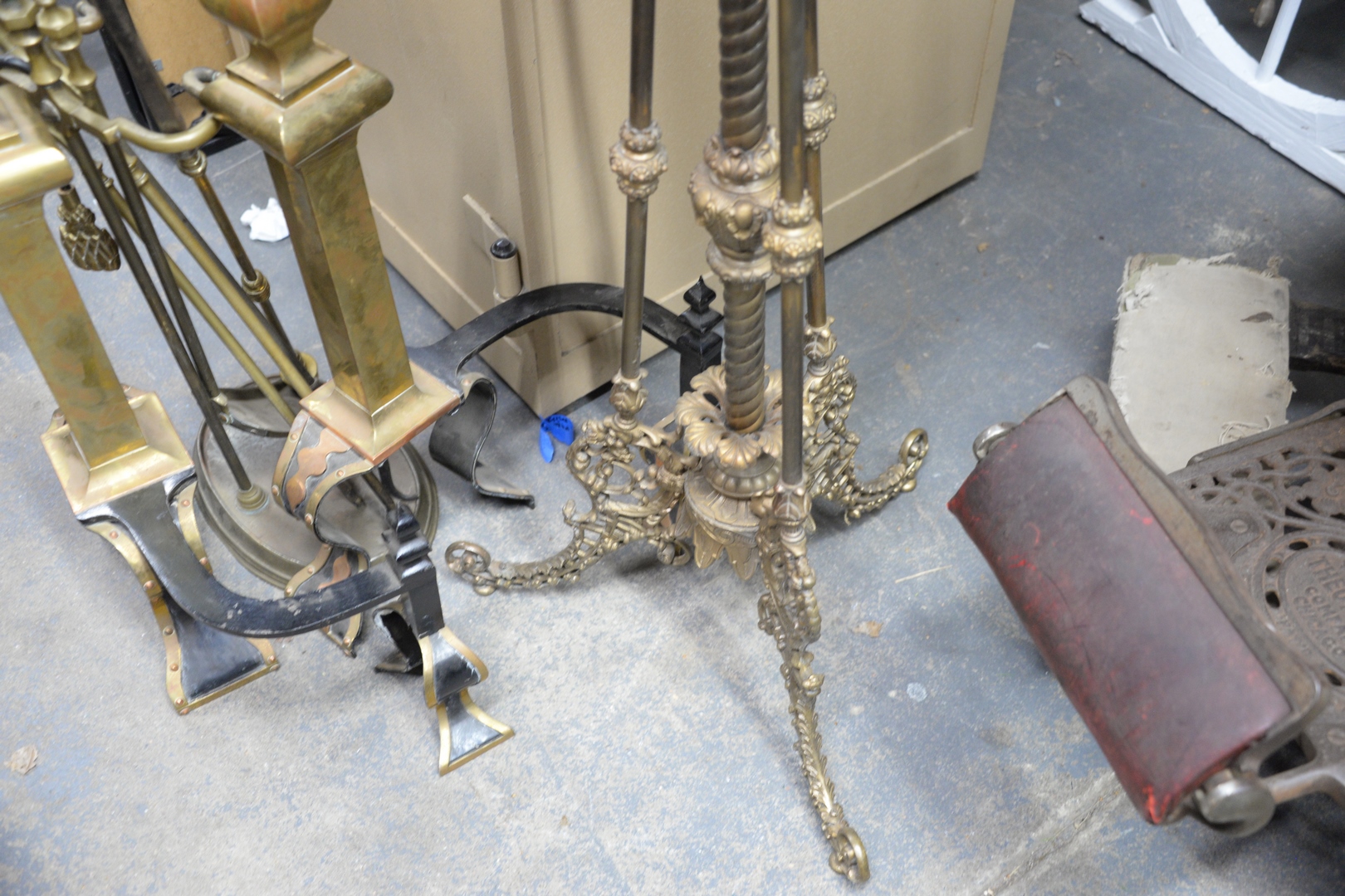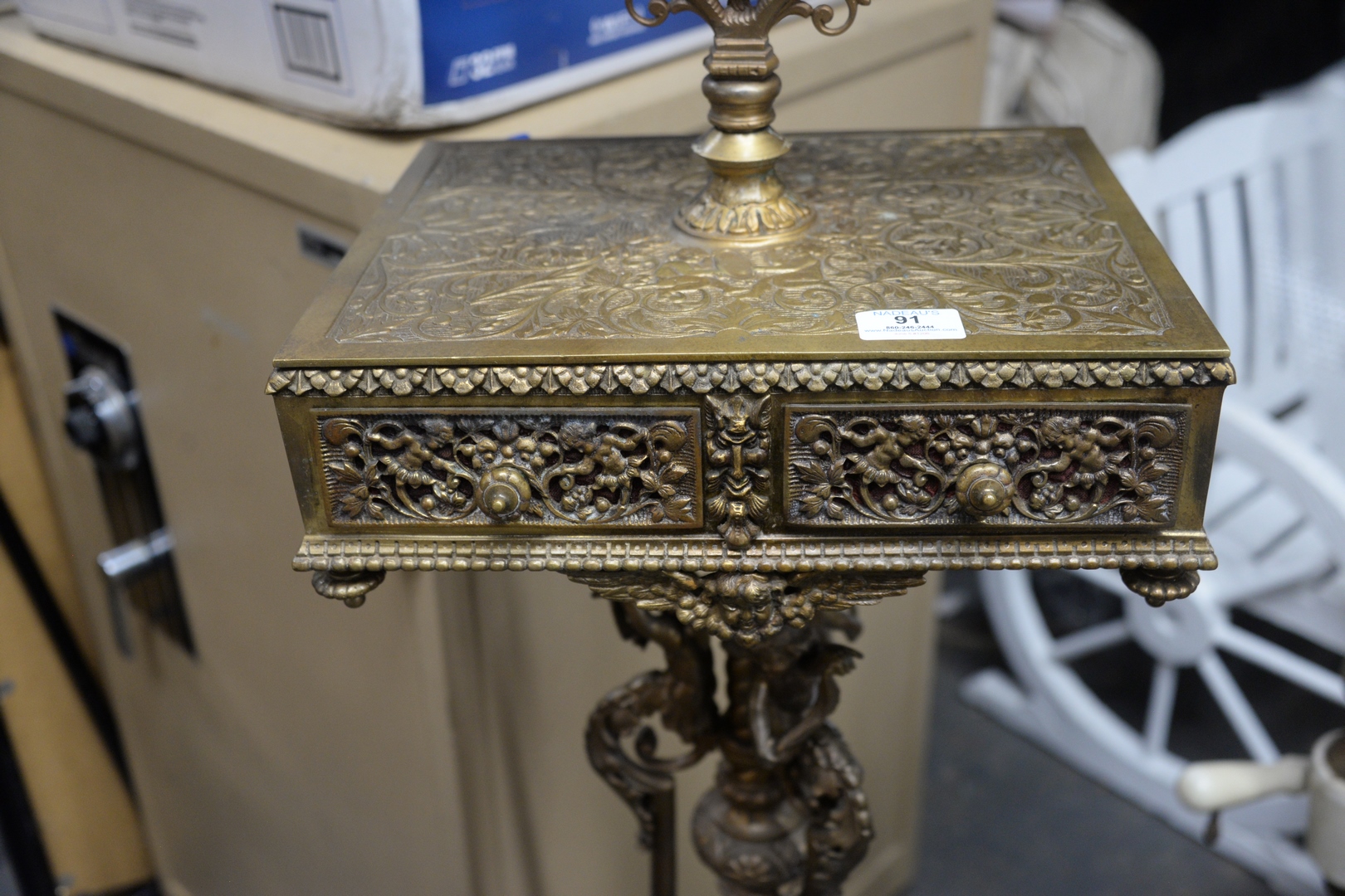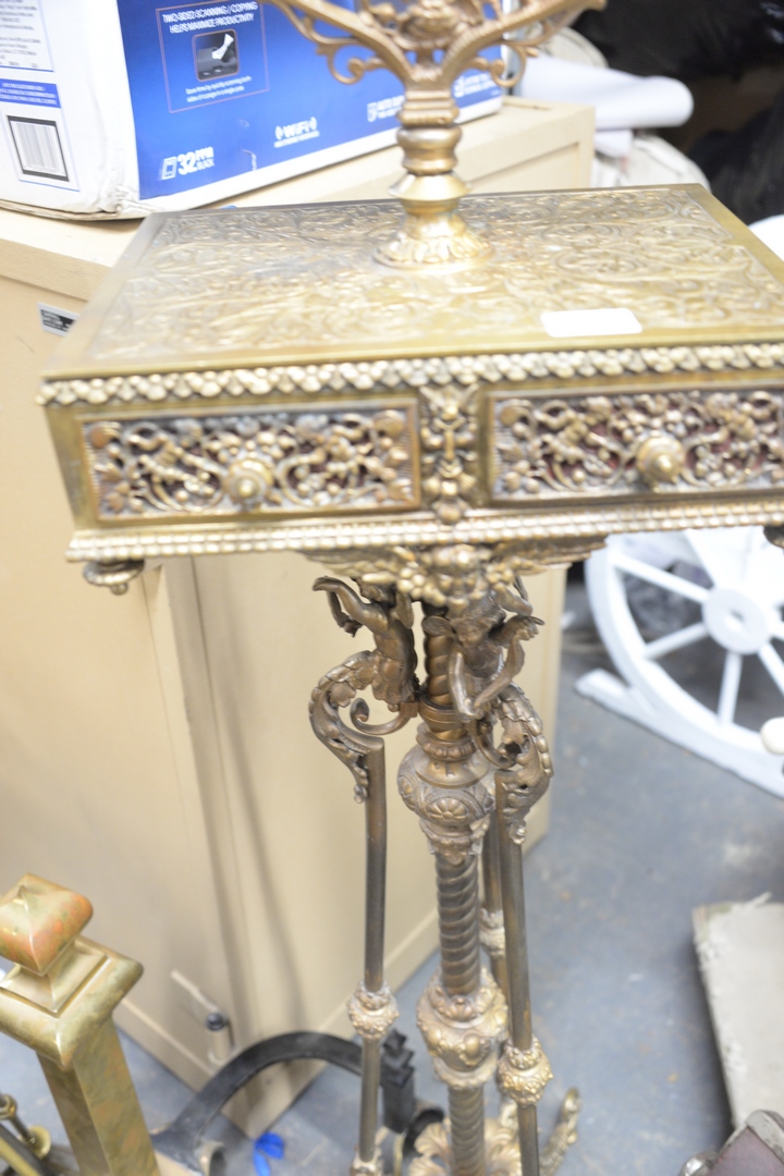 Lot 91: Victorian Brass Shaving Mirror on Stand, having two drawers supported by putti figures, height 49 inches.