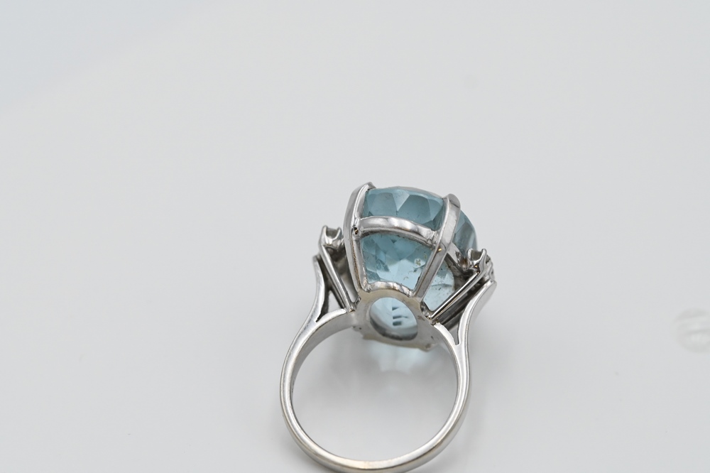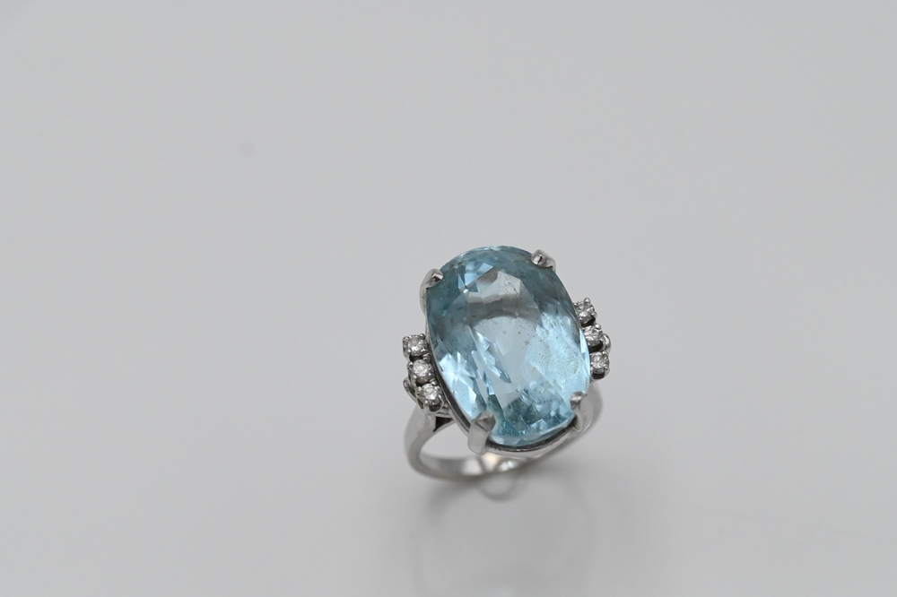Lot 92: 14 Karat White Gold Ring, set with large blue topaz, flanked by three diamonds on either side, size 7 1/4, 14.5 x 20.7 millimeters.