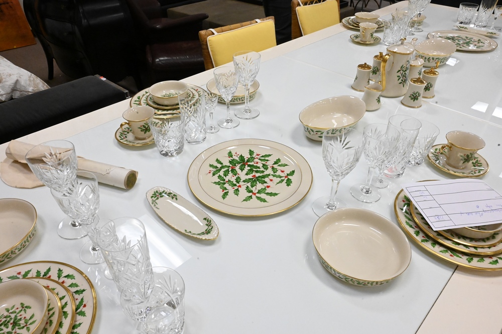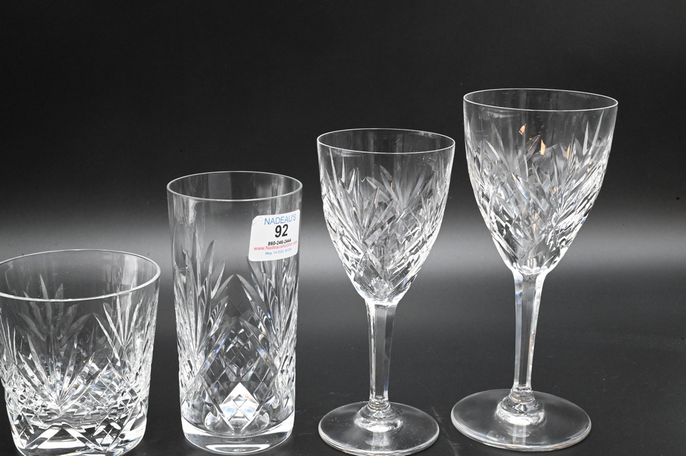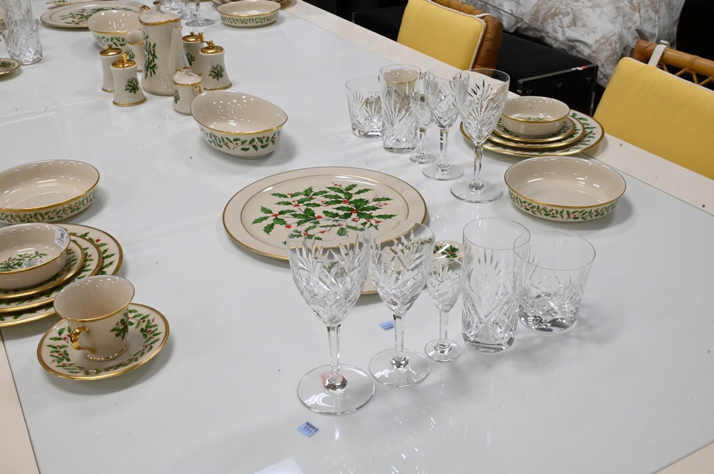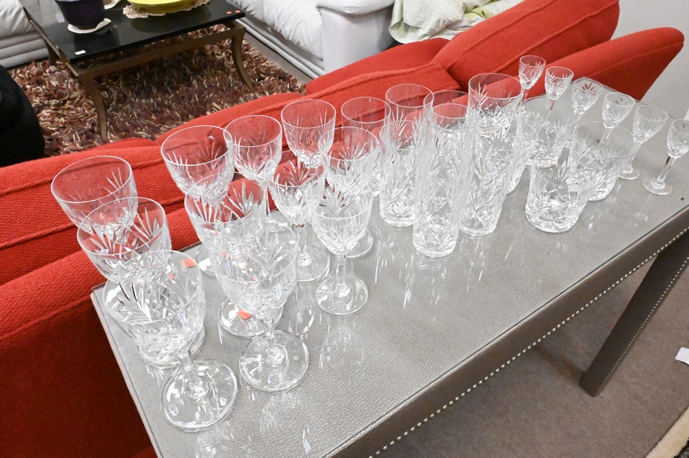 Lot 92: 59 Piece Set of St. Louis Crystal Stems, Chantilly Clear pattern, to include 12 stemmed water goblets, 7 7/8″; 11 red wine, 7″; 12 cordial, 4 5/8″; 12 highball, 6″; along with 12 old fashioned, 4″; $6,500 replacement cost. Provenance: An estate from Redding, CT.