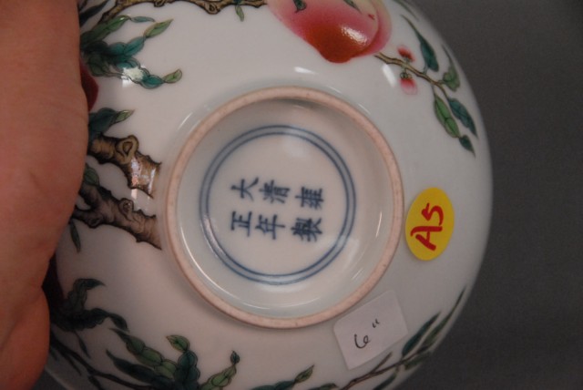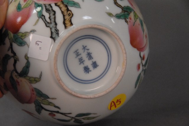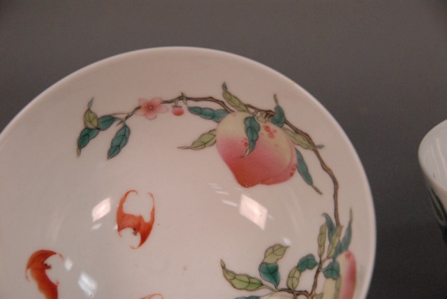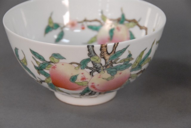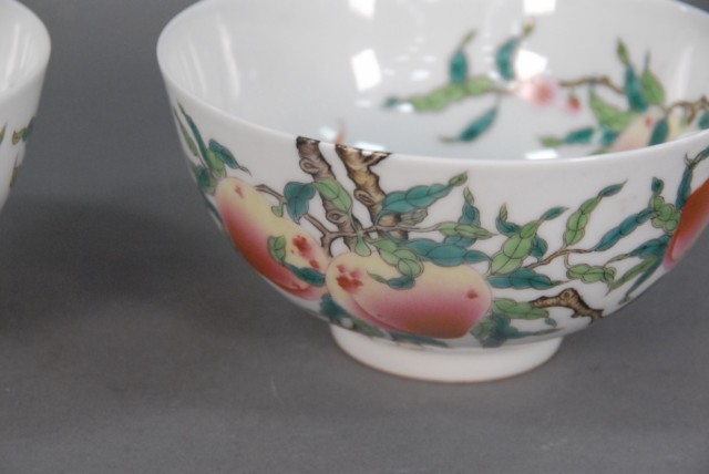 A pair of Famille Rose Eight. Peaches bowls with Yongzheng mark