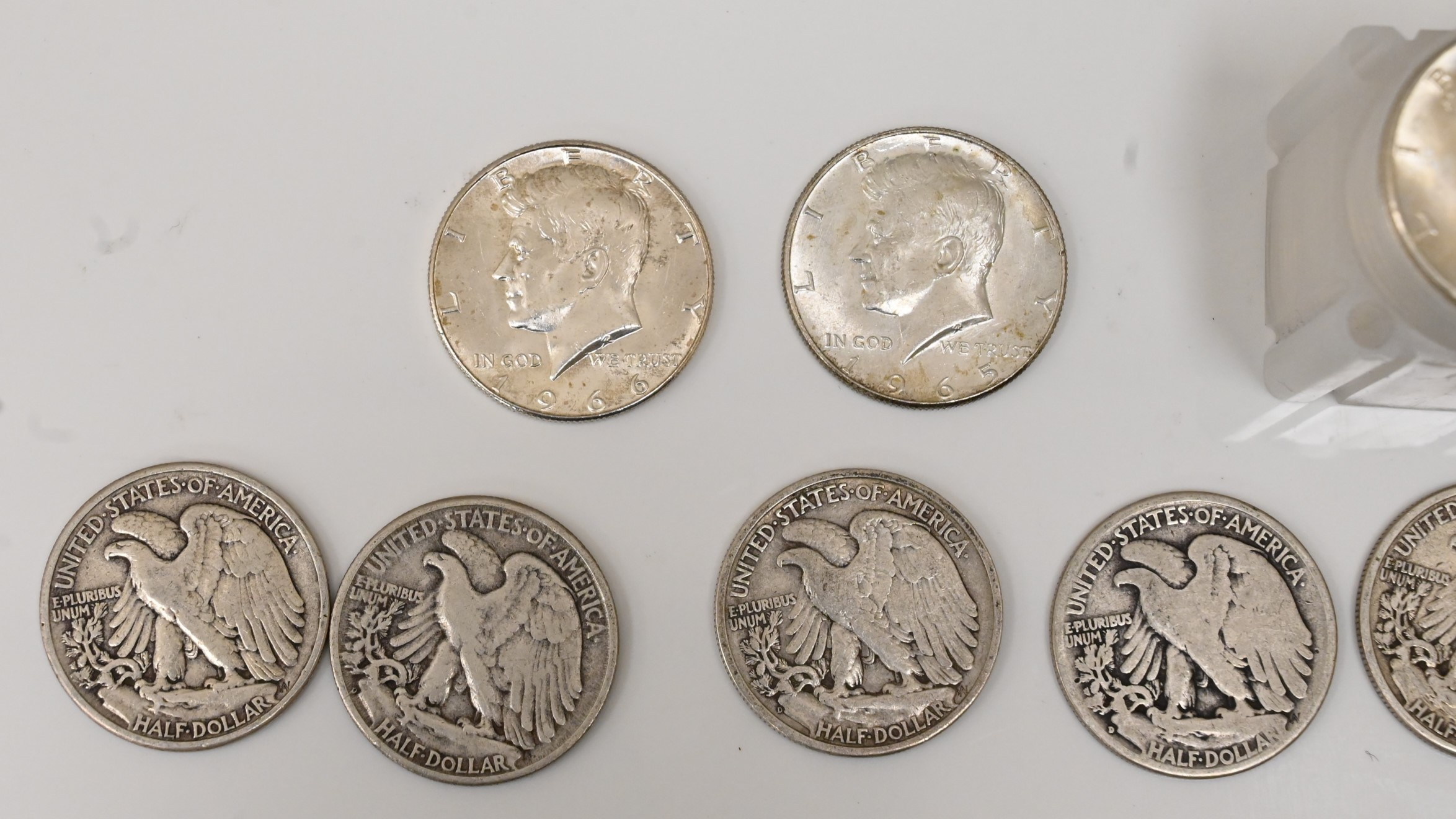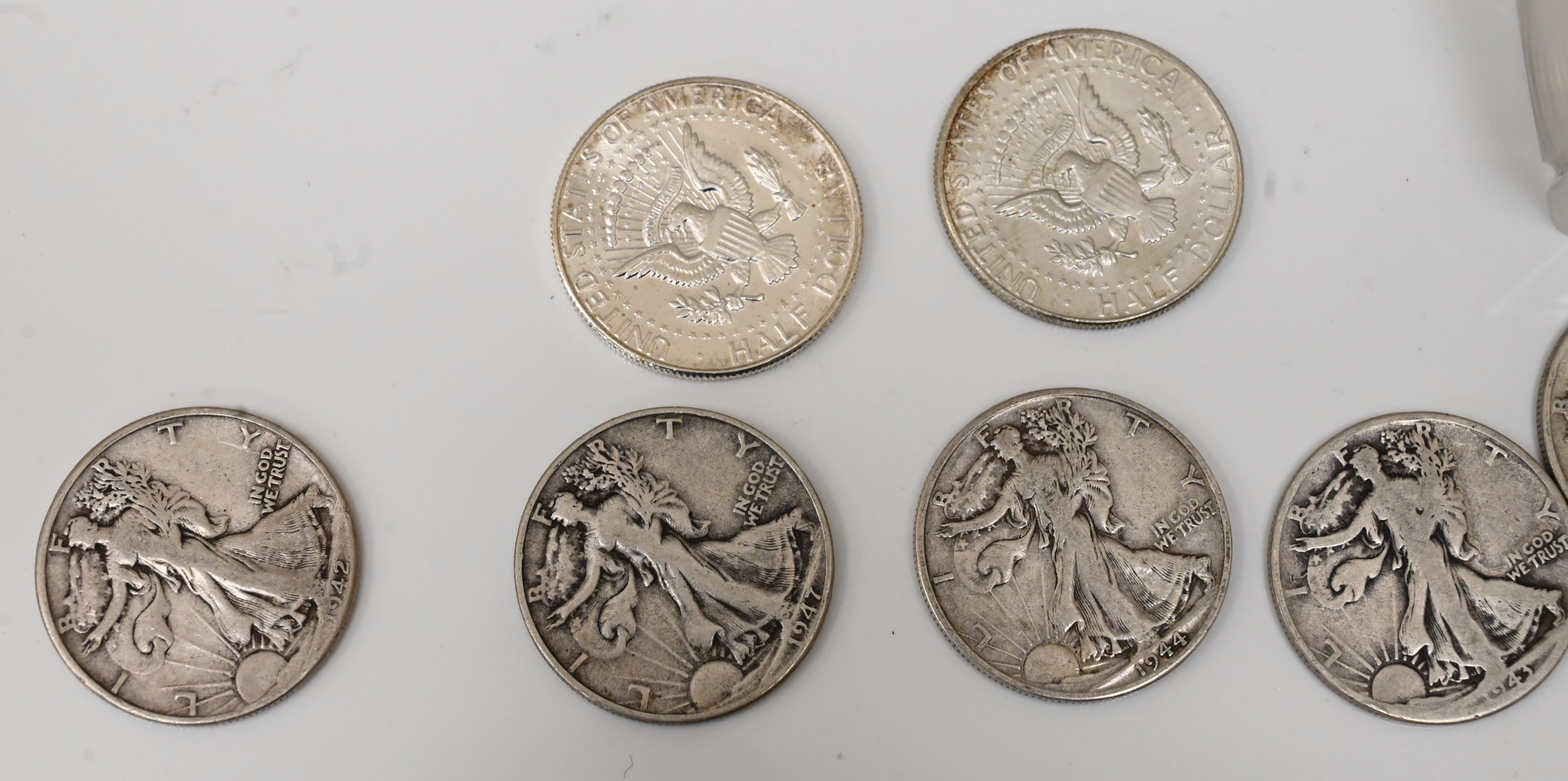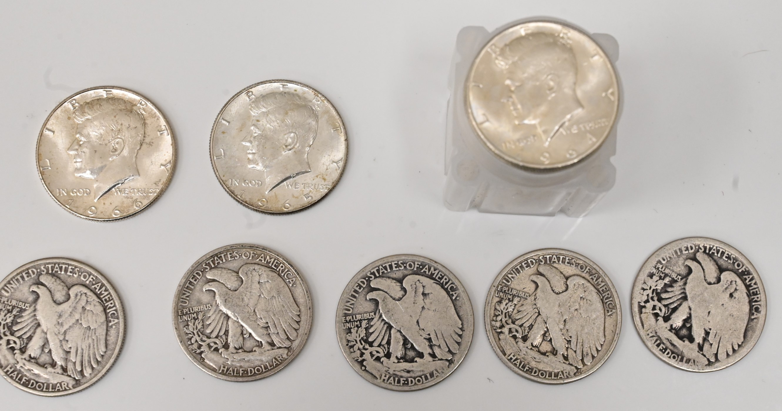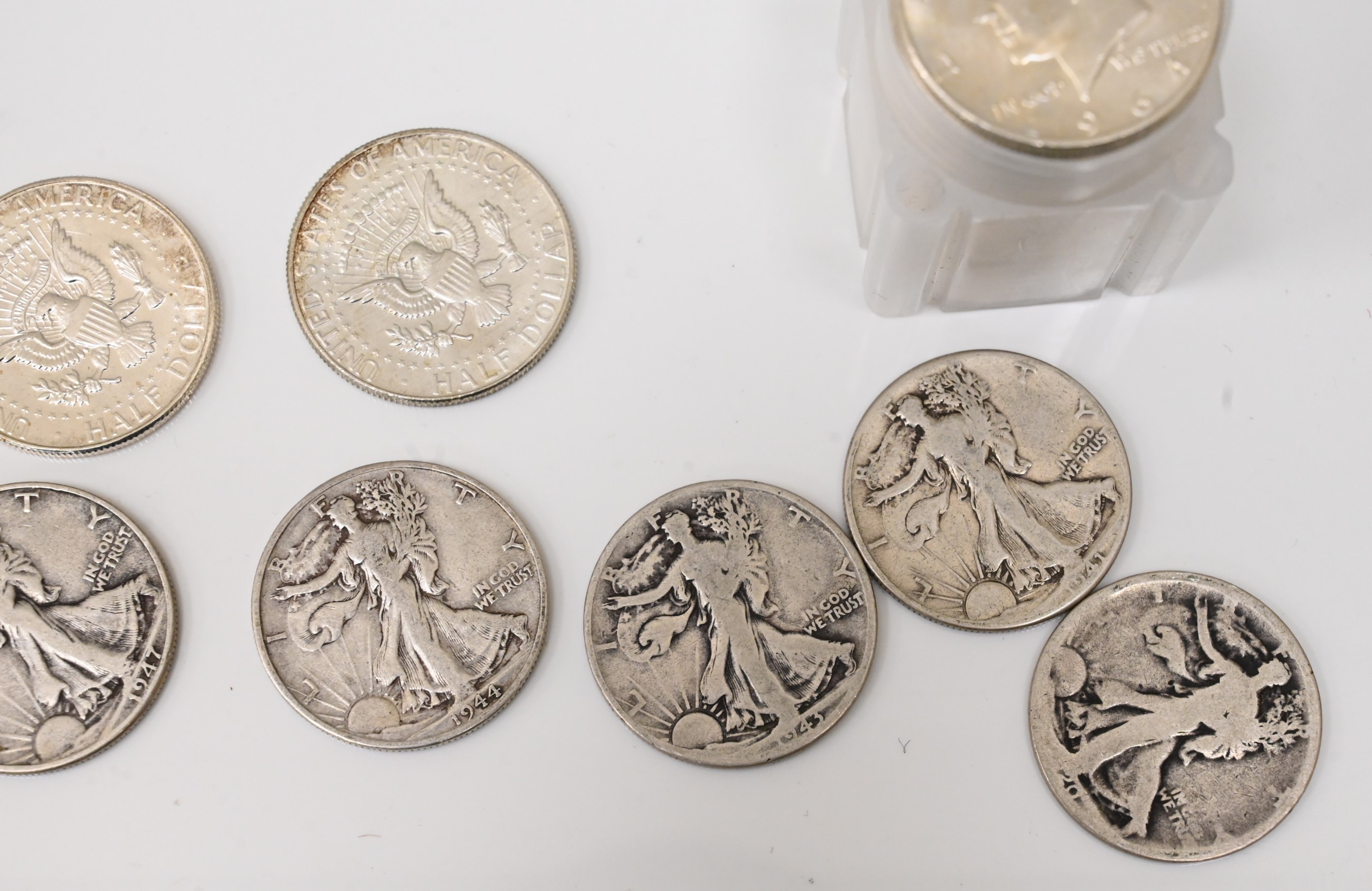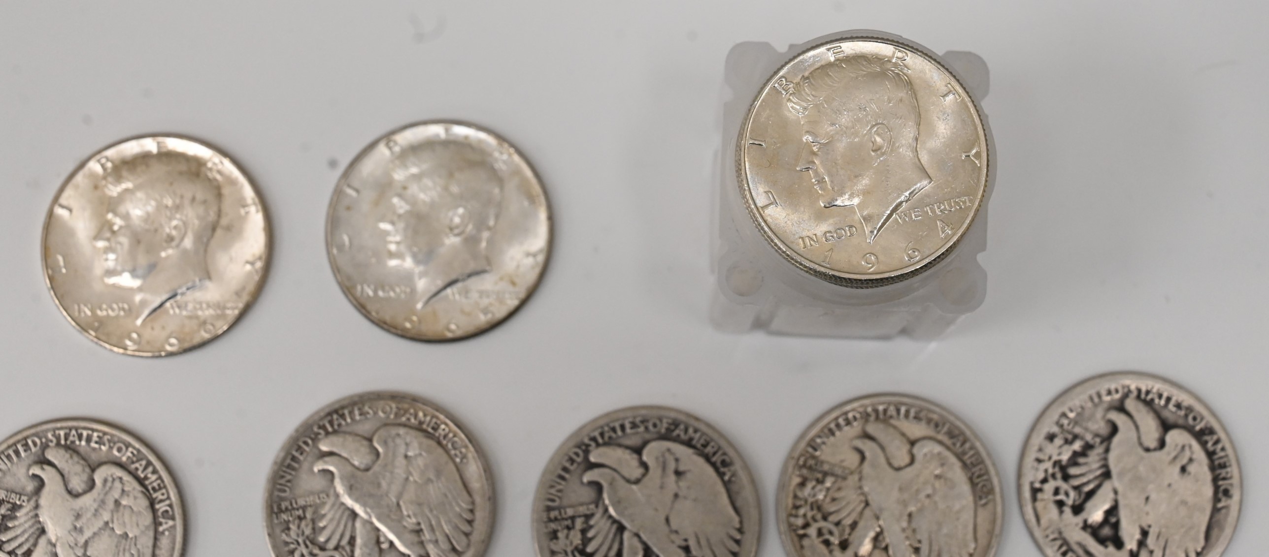 Coin Lot of U.S. 90% Silver Half Dollars, to include U.S. 90% silver half dollars, along with 40% halves comprising of twenty 1964 halfs, six walking Liberty halves, along with 40% halves.