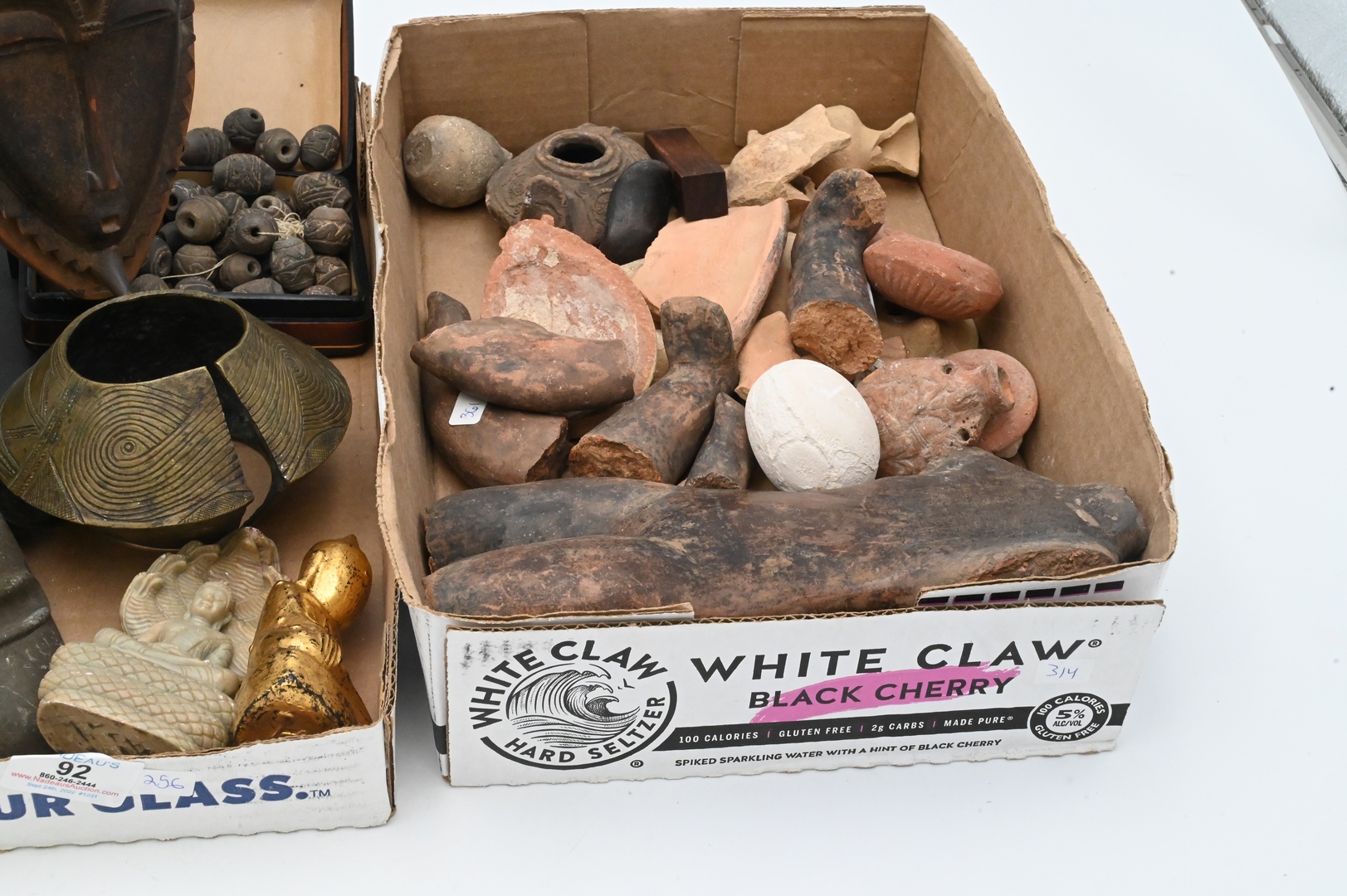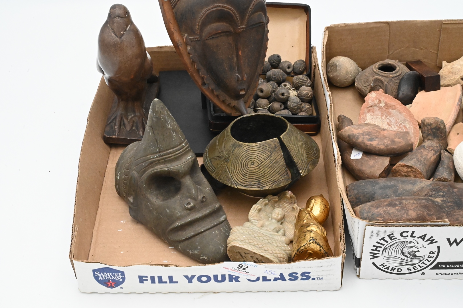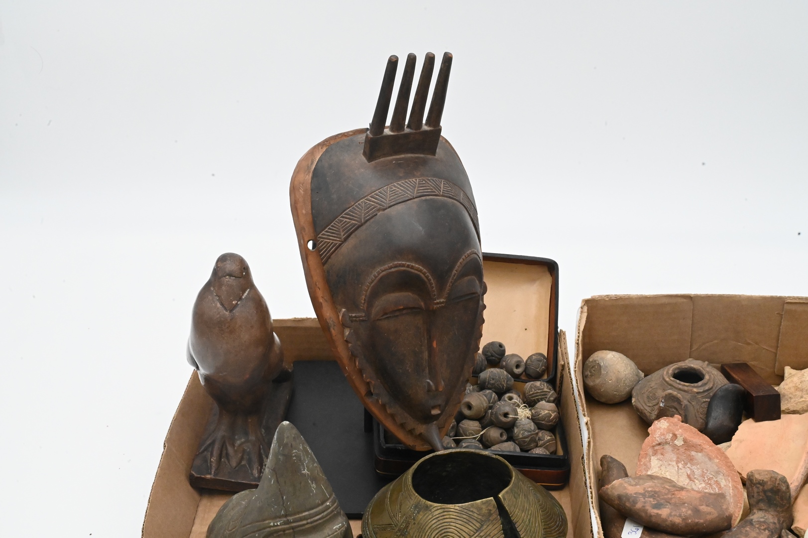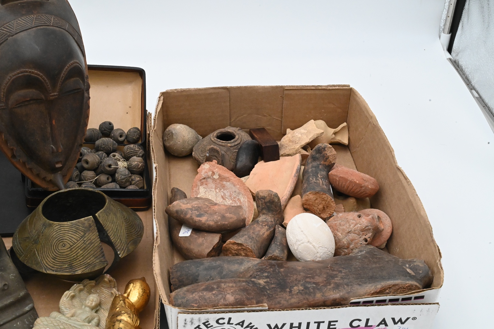 Early Pottery and Artifacts Group, to include oil lamps, small urn, fragments of early pottery, mask, Pre-Columbian beads, bronze cuff, etc.