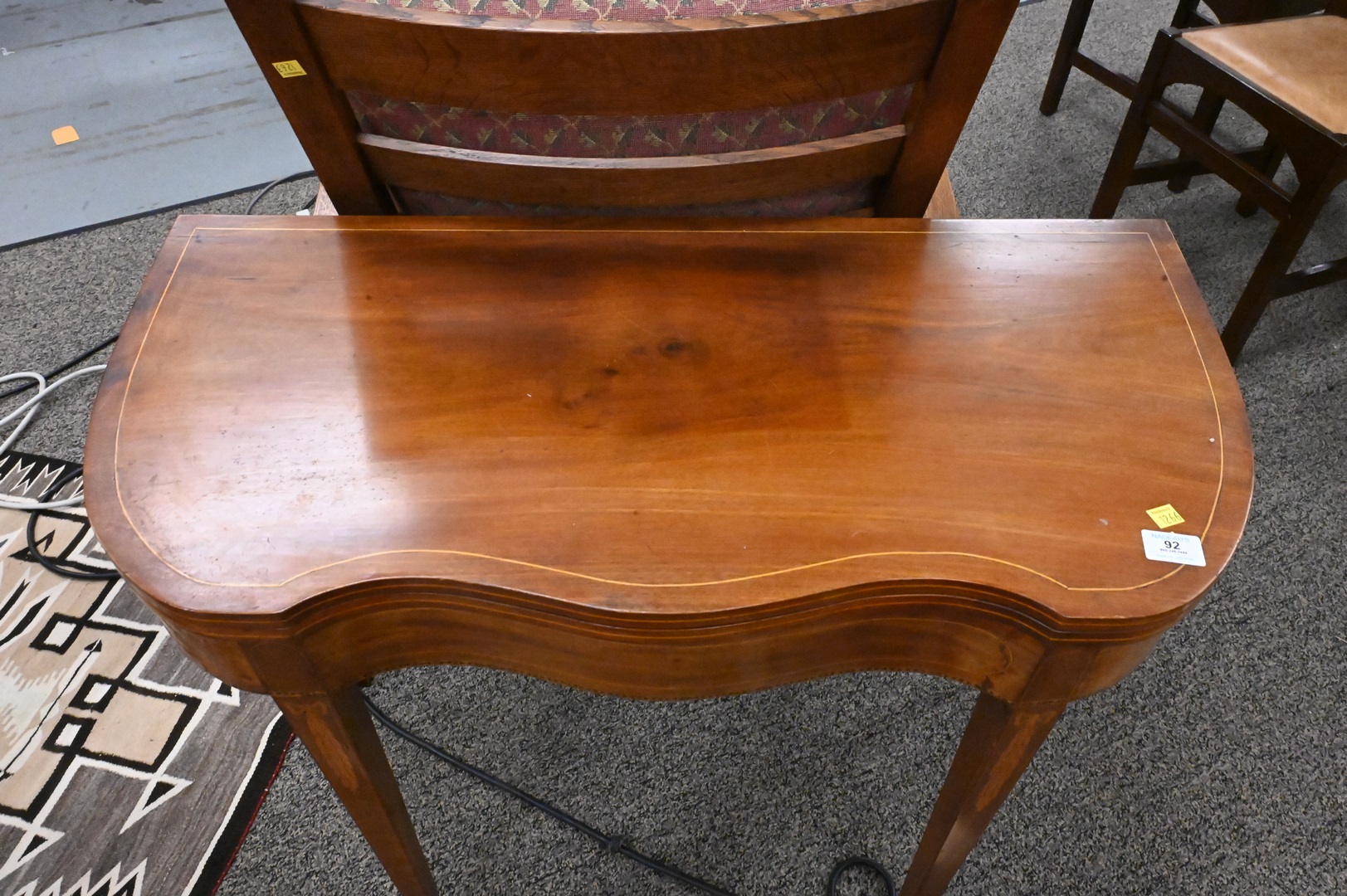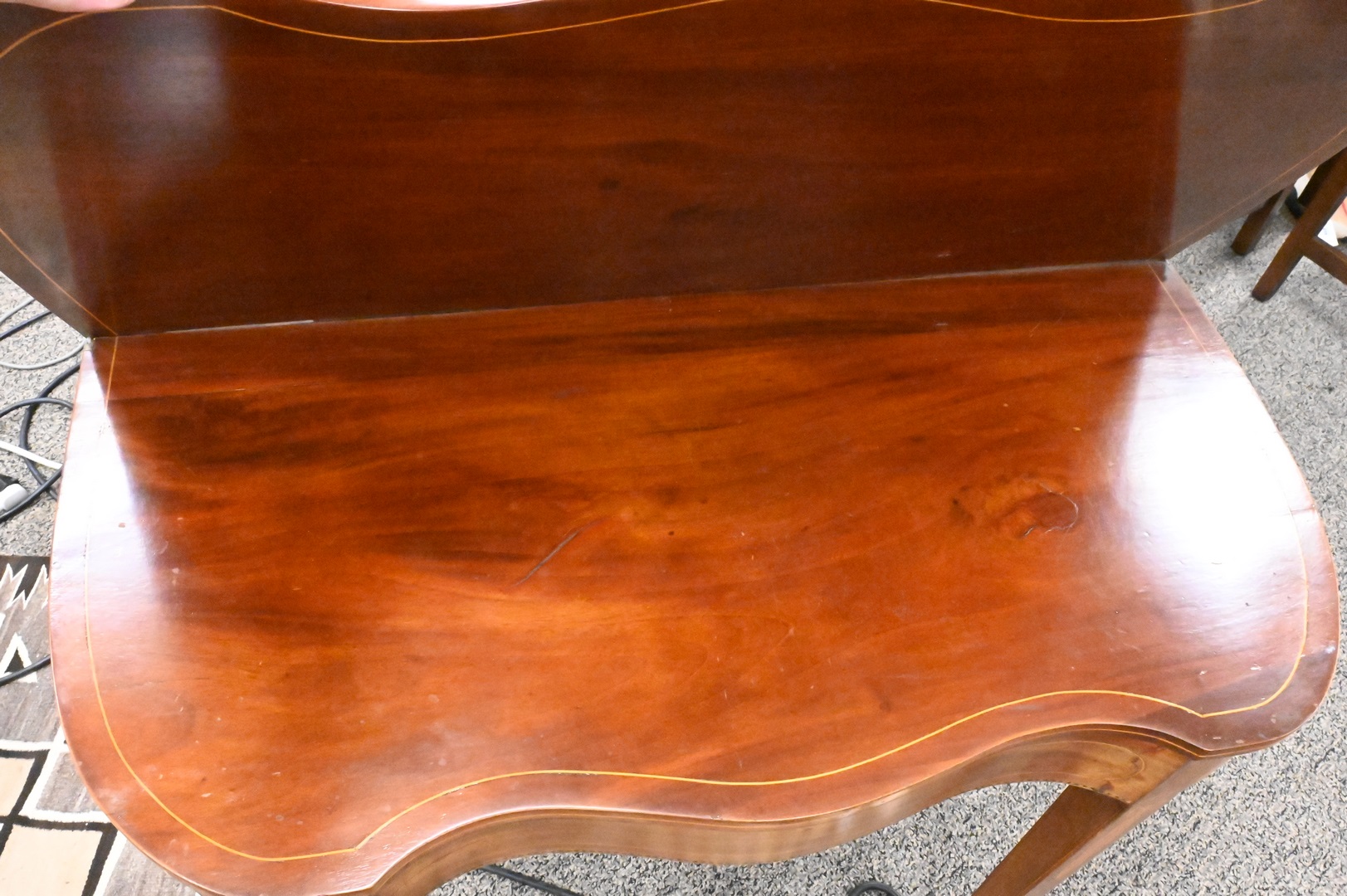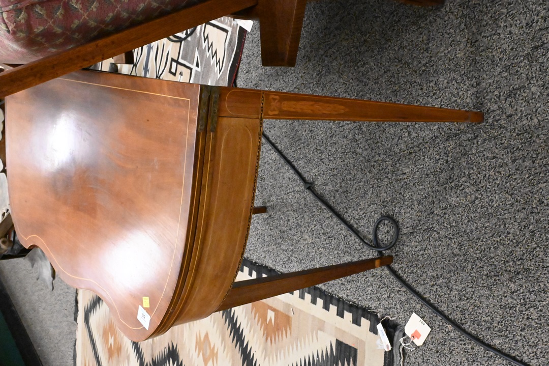 Federal Mahogany Game Table, having serpentine front on square tapered legs, bow and floral inlaid legs, circa 1800, height 29 1/2 inches, top 17 1/4″ x 35 3/4″.