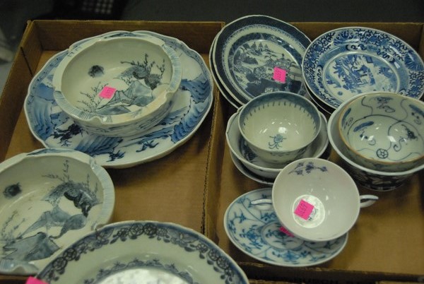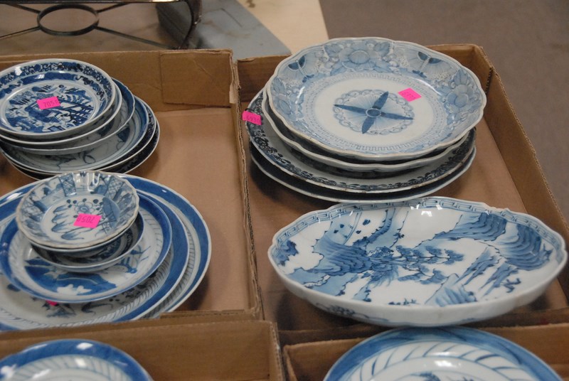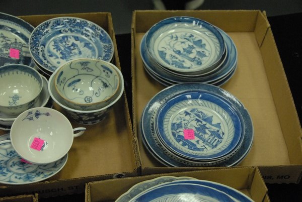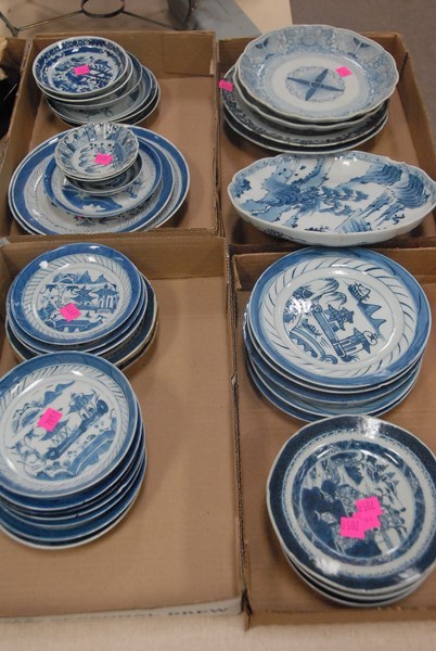 Lot 92: Five box lots of blue and white Canton to include bowls, plates, cups, small dishes, saucers, etc.