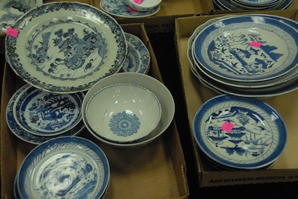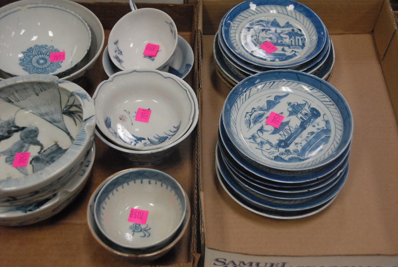 Five box lots of blue and white Canton to include bowls, plates, cups, small dishes, saucers, etc.