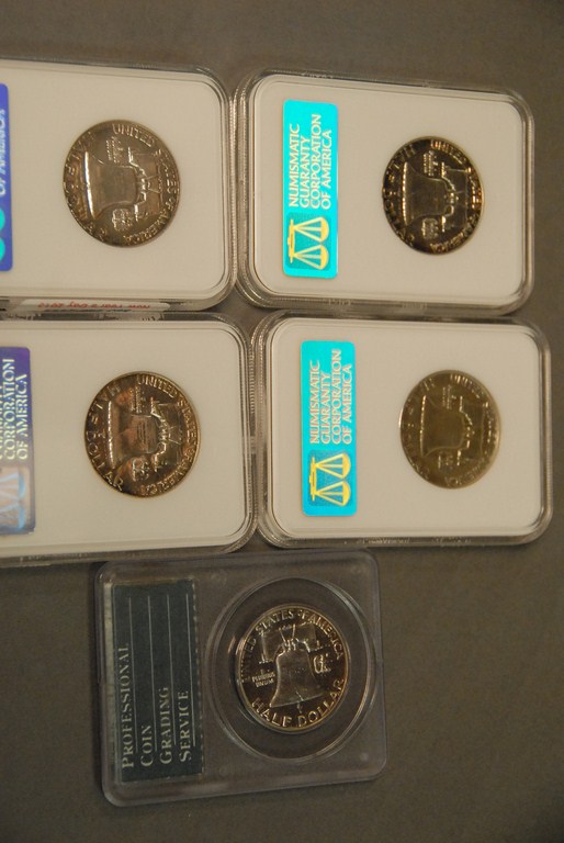 Five proof half dollars 1952 NGC PF 66, 1953 NGC PF 66, 1954 NGC PF 67, 1955 NGC PF 67, and 1955 PCGS Proof 66.