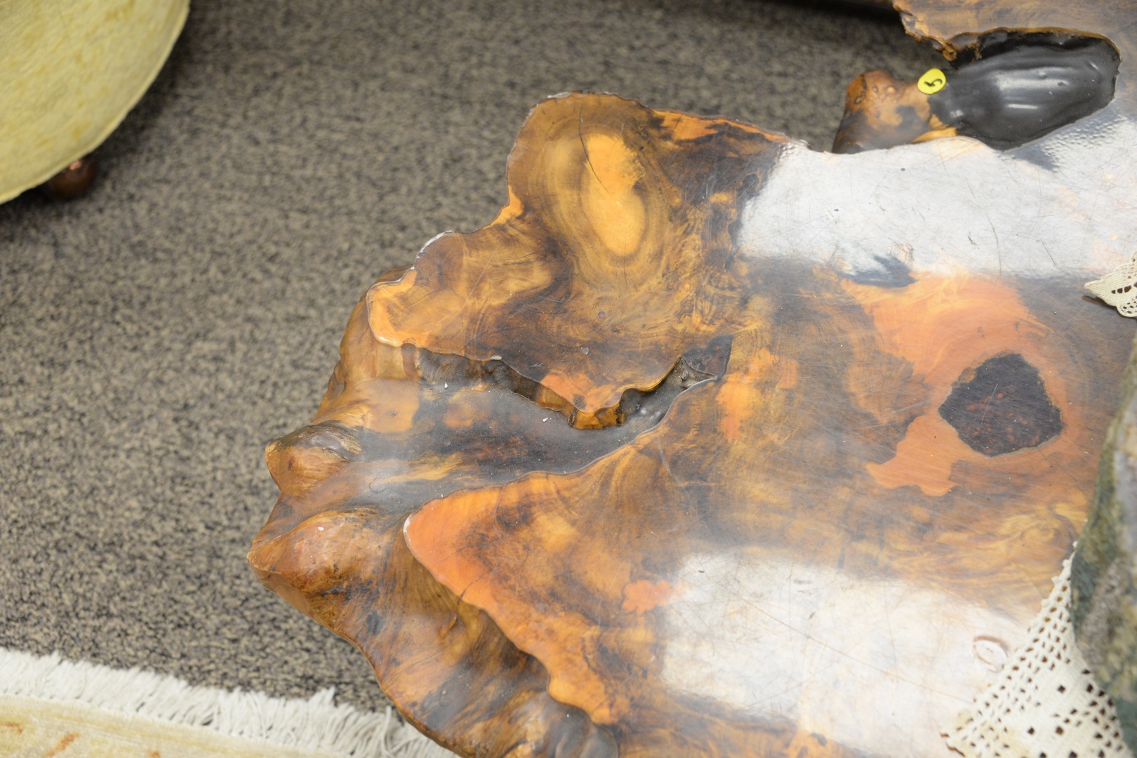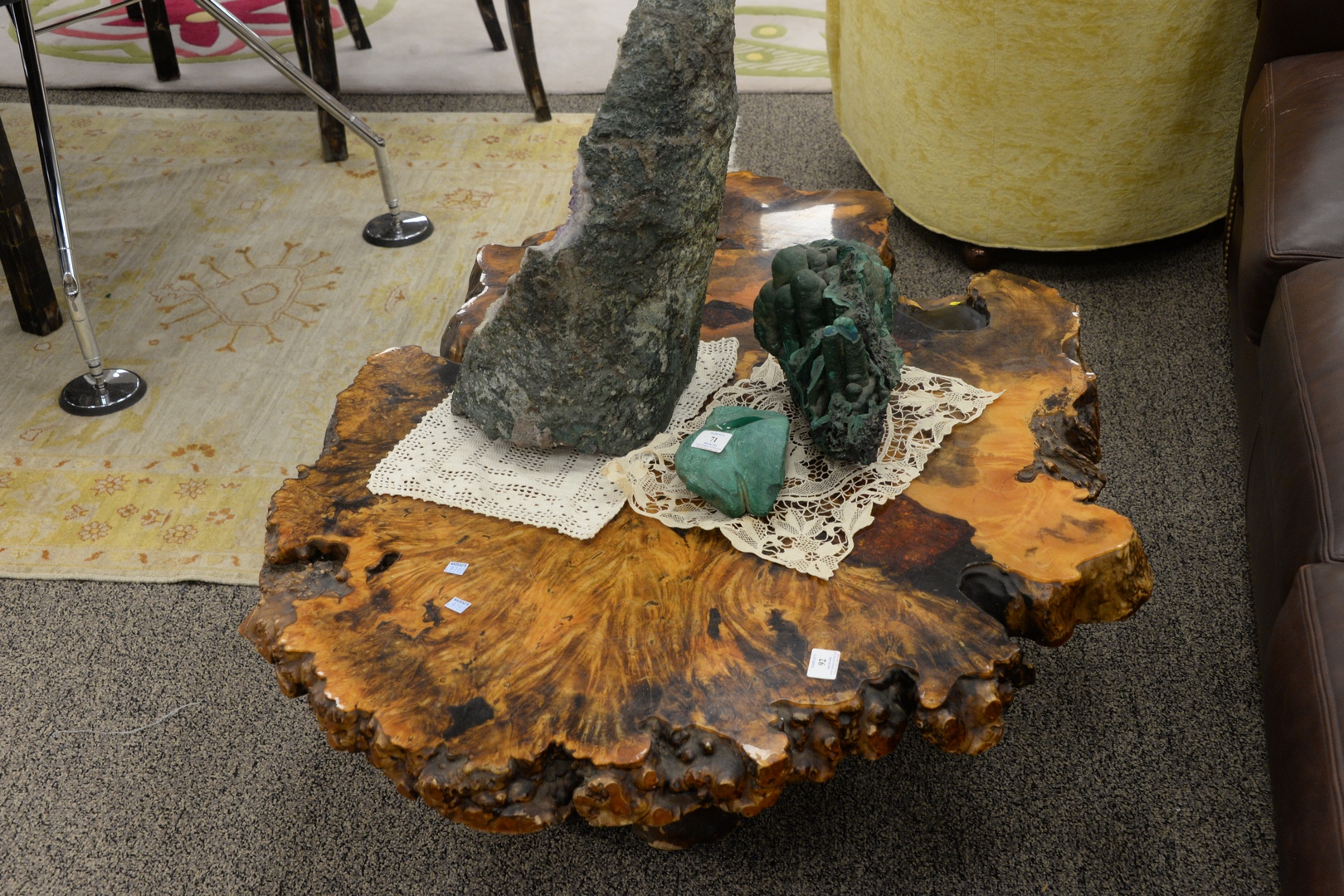Lot 92: Freeform Root Coffee Table, having thick, clear resin top, freeform wood base, height 16 inches, top: 36″ x 48″.