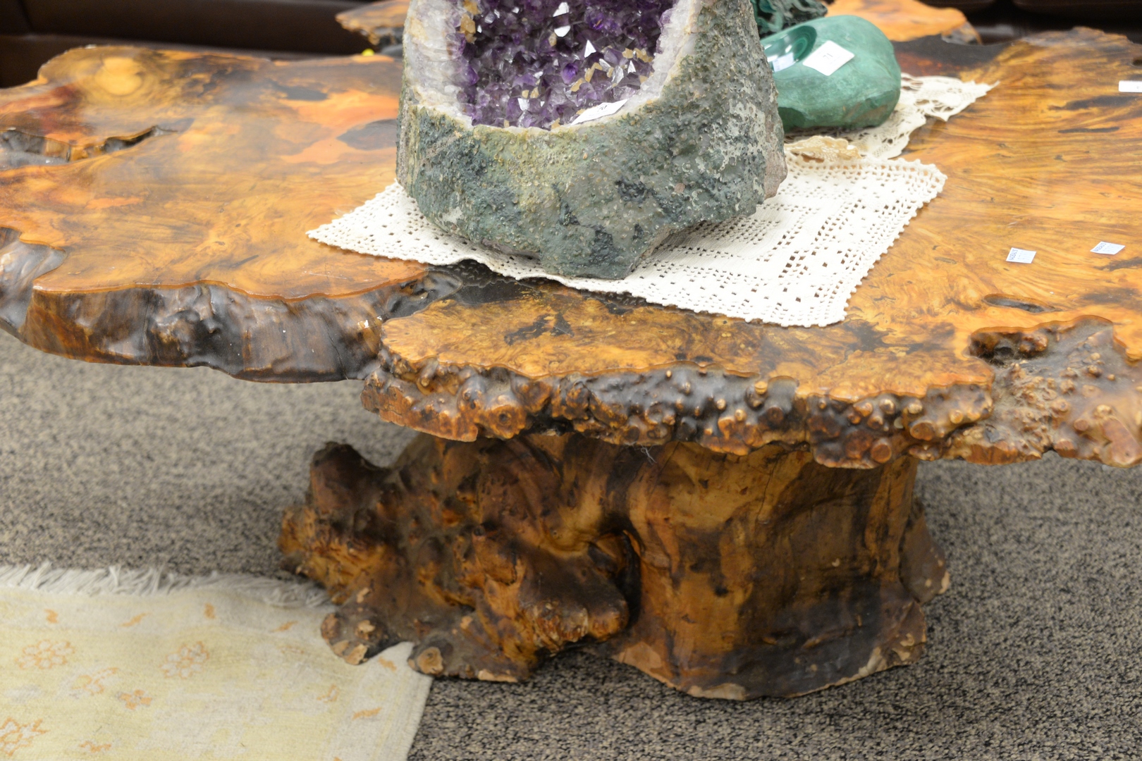 Freeform Root Coffee Table, having thick, clear resin top, freeform wood base, height 16 inches, top: 36″ x 48″.