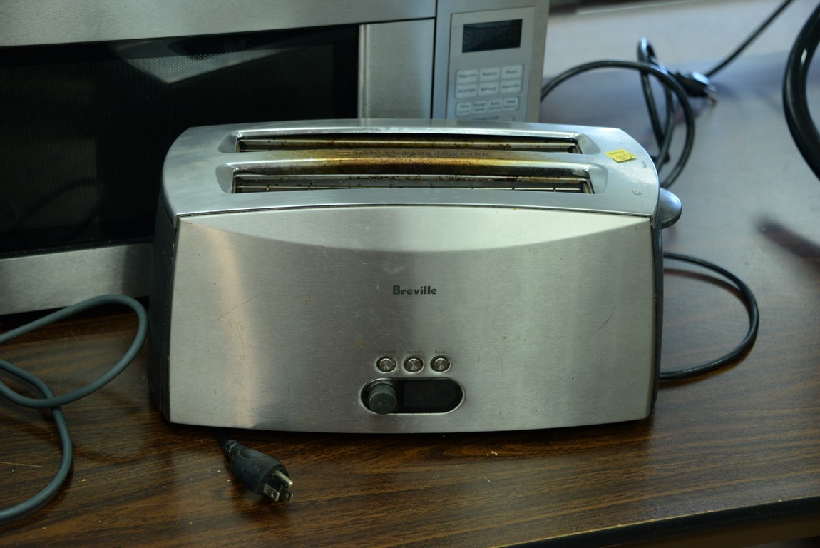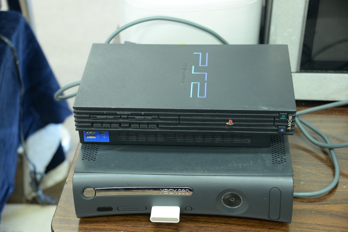 Group of electronics including Xbox, PS2 Playstation, G.E. microwave, Oster toaster.