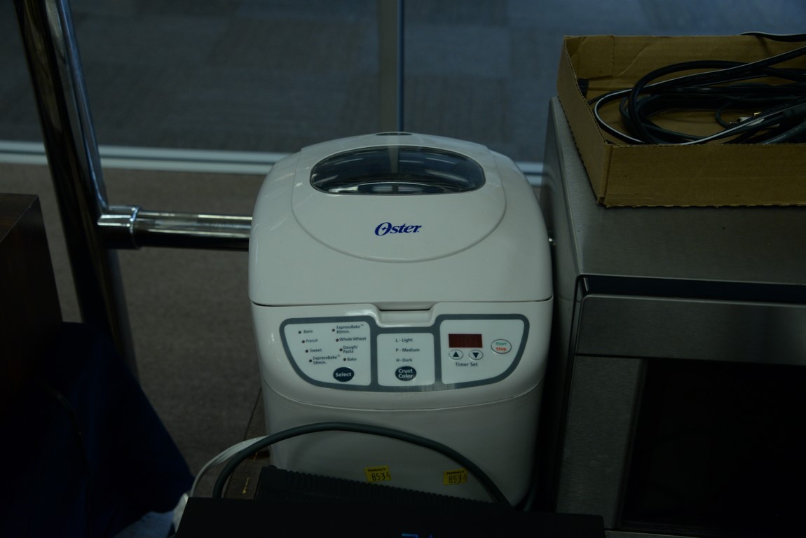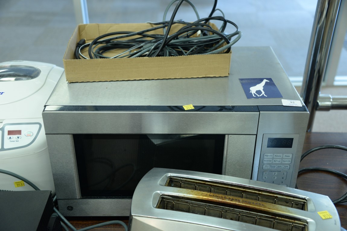 Lot 92: Group of electronics including Xbox, PS2 Playstation, G.E. microwave, Oster toaster.
