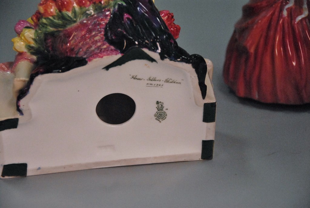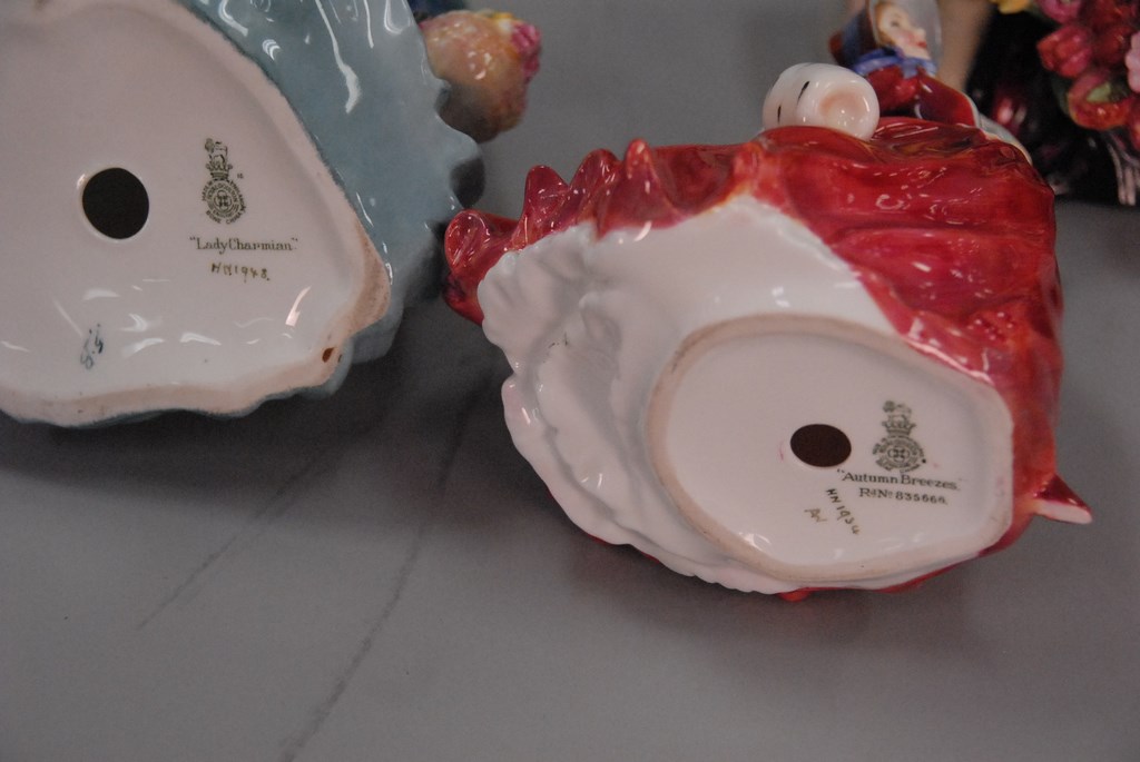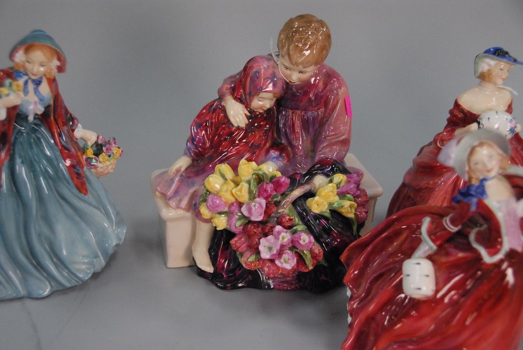 Lot 92: Group of five Royal Doulton figures Top of the Hill, Autumn Breezes, Flower-Sellers-Children, Genevieve, and Lady Charmain…