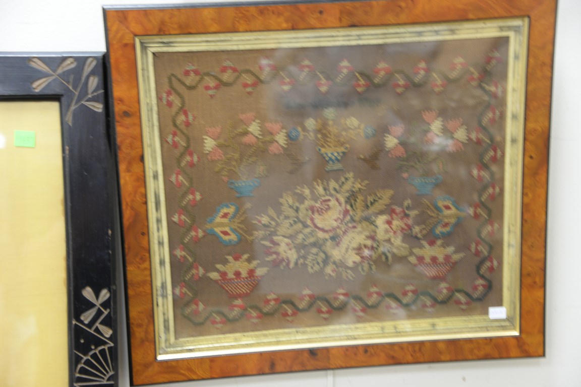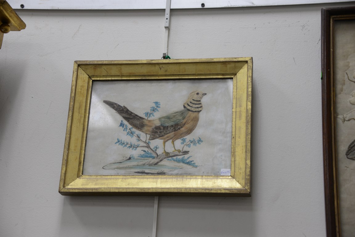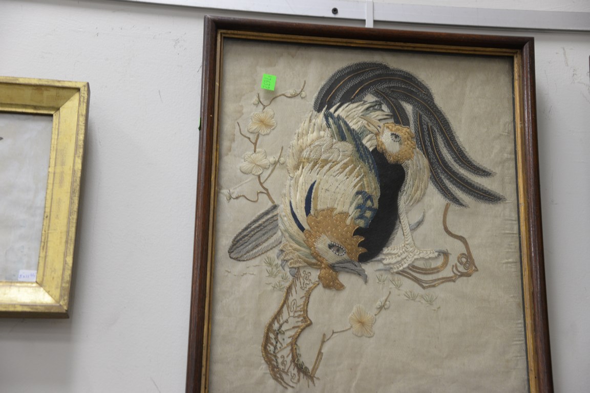 Lot 92: Group of six embroideries to include Oriental embroidery on silk, sampler, two embroideries of birds, watercolor of bird with feathe…