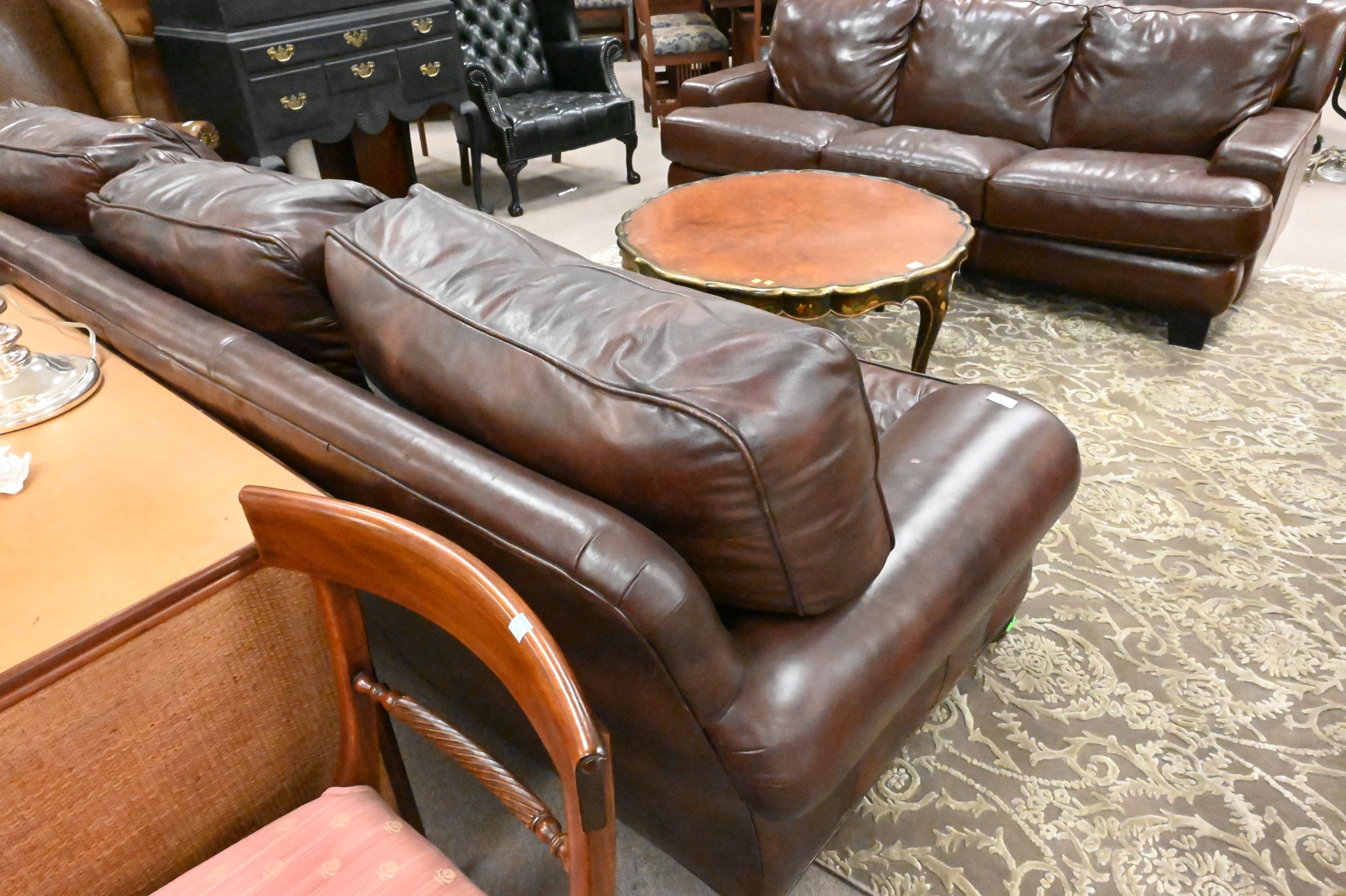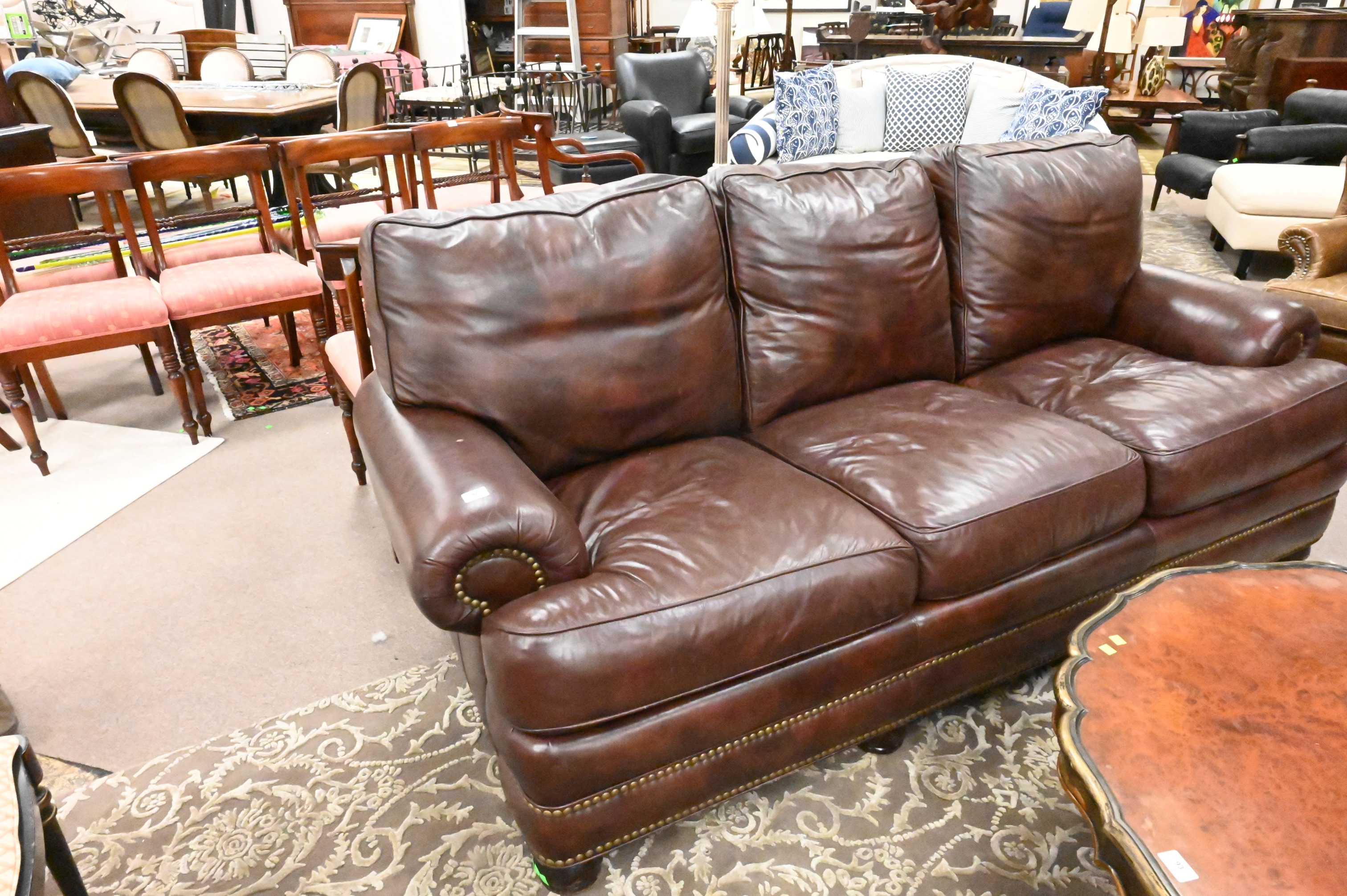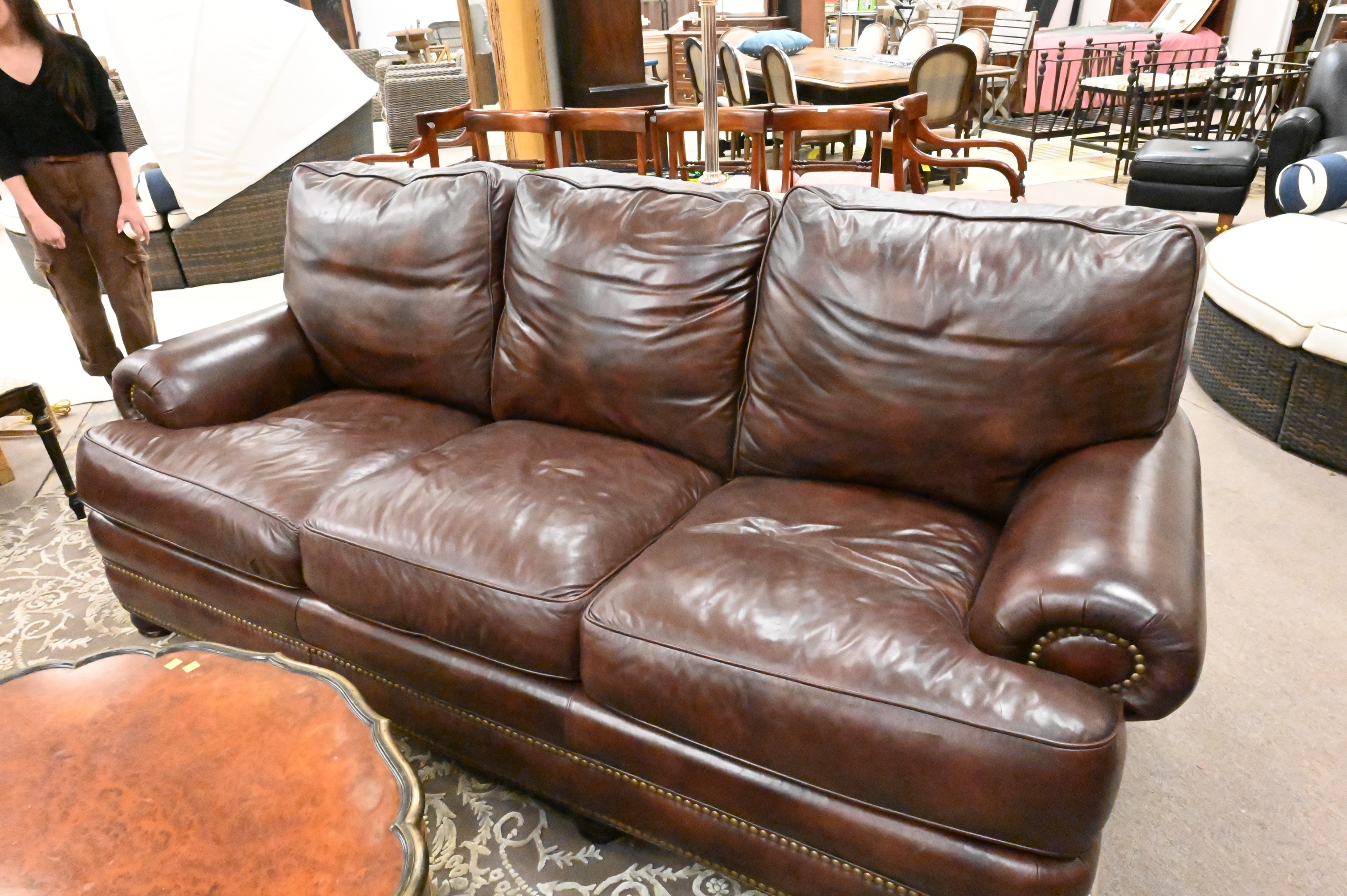 Hancock and Moore Leather Sofa, having three cushions, height 39 inches, length 80 inches.
