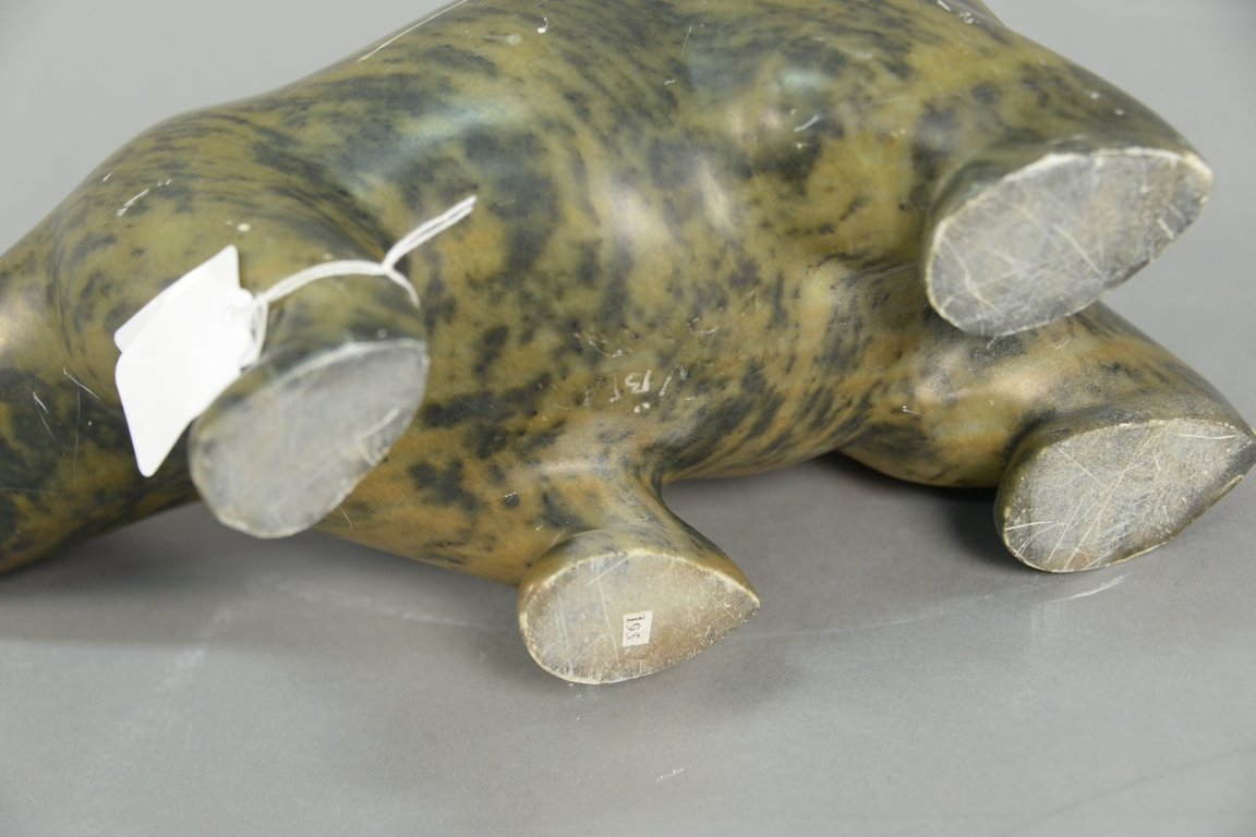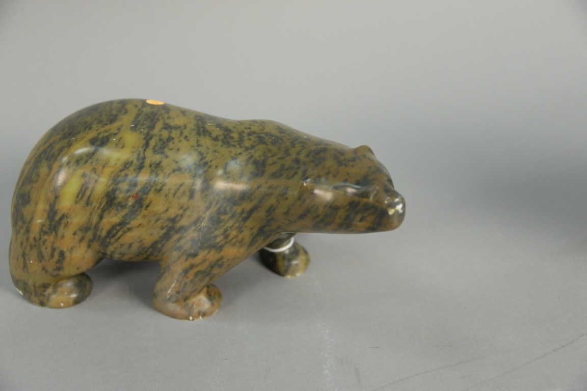 Lot 92: Inuit Eskimo carving Mark Totan 1953 brown/black Brazilian soapstone Large Polar Bear. ht. 6in., lg. 12in., pedestal ht. 30in.