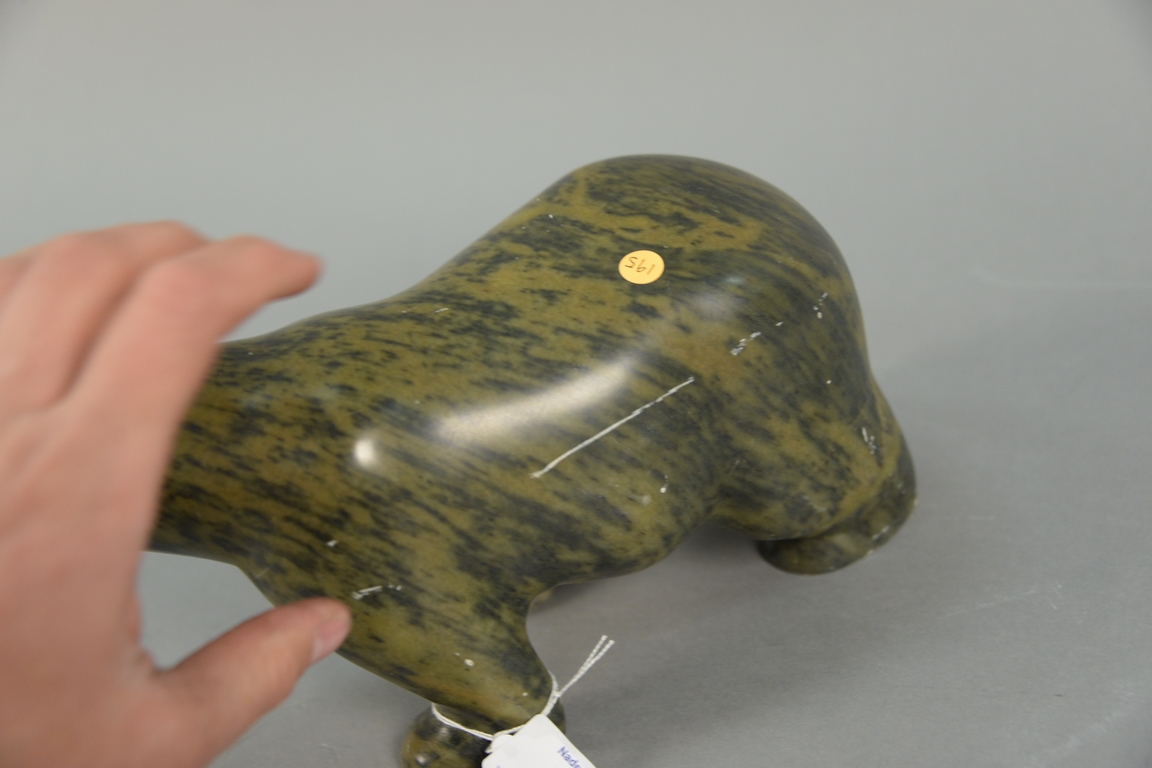 Inuit Eskimo carving Mark Totan 1953 brown/black Brazilian soapstone Large Polar Bear. ht. 6in., lg. 12in., pedestal ht. 30in.